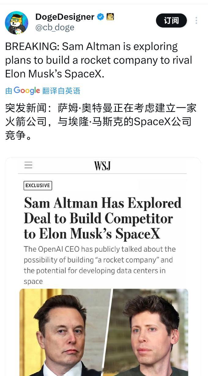 奥特曼又要跟马斯克干起来了,计划收购或者建立一家火箭公司,与马斯克的 SpaceX 竞争。不过一家 AI 公司造火箭我也点不太明白,为了以后在太空建立数据中心?