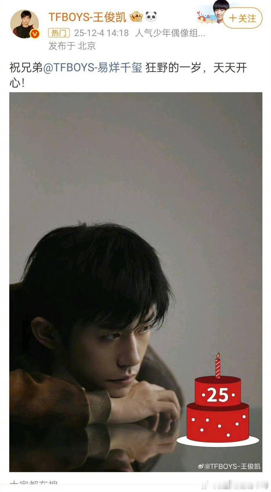 王源和王俊凯双双发博为易烊千玺庆生,真是时代的眼泪了。tfboys三个人在我有生之年还能够合体出席活动吗