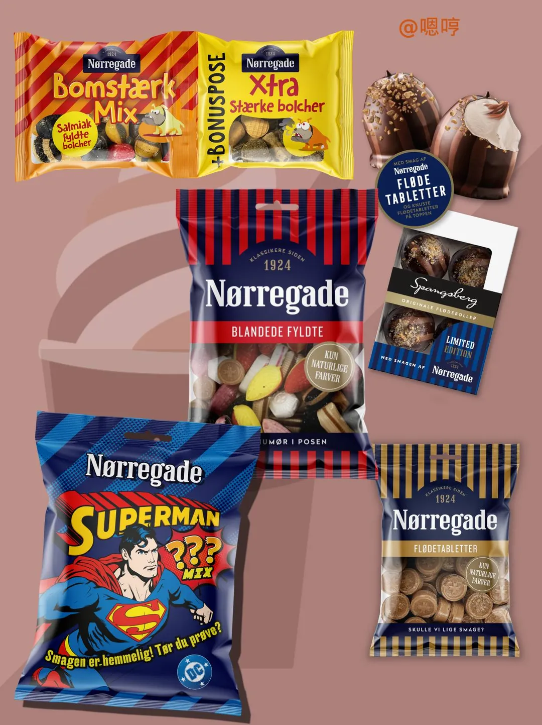 强势甘草系列(Lakrids): 北欧最具特色的甘草口味在 Nørregade Bolcher 中占有重要地位,涵盖甜甘草、咸甘草、强风味黑甘草等。