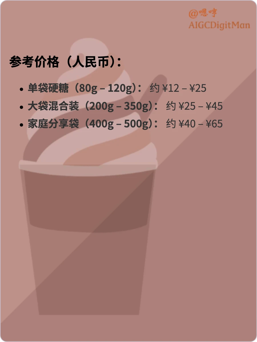 单袋硬糖(80g – 120g): 约 ¥12 – ¥25