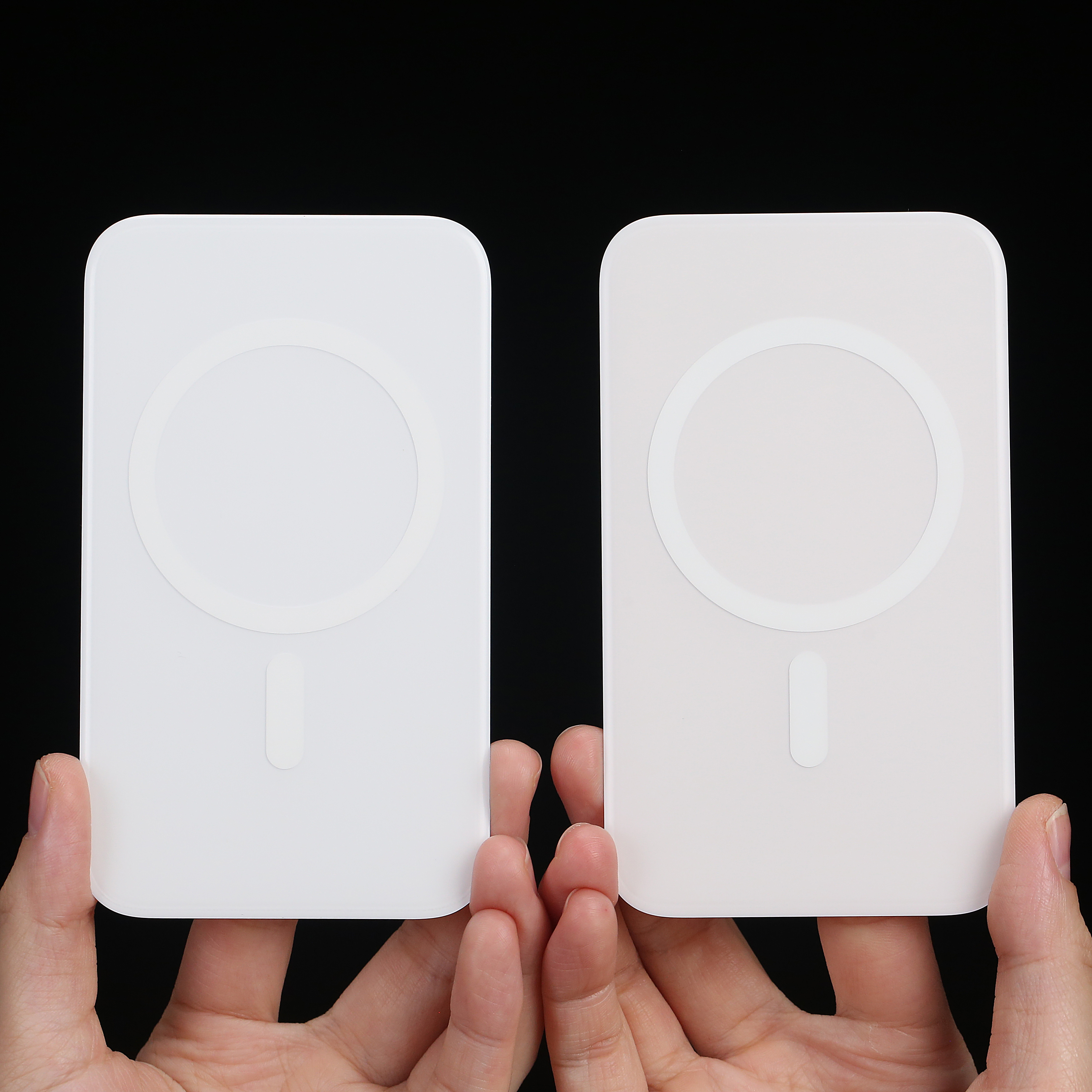 iPhoneAir 淡金色的平嵌磁贴跟平嵌镜盖明天上架。图一中两个颜色有一点色差,是因为这两个用的片材厚度不一致,镜盖用的是2.5mm的片材,磁贴用的是1mm的片材。不同厚度的片材,它这个本身的颜色也会有点差异,加上这个厚度不同,做上同一个颜色,它表现出来的颜色的观感就是有点点不太一样,没法做到一致。图二是我们贴上去的效果,可以看到磁贴跟这个金色的手机比较接近,但是镜盖的话会比机身的颜色淡那么一点点。图三是我们几个镜盖颜色的对比。图四是左边白色跟右边淡金磁贴的对比。这个淡金色,单独看的话,其实有点像是米白色。只有跟白色放在一起对比,才看得出来它是淡金色。