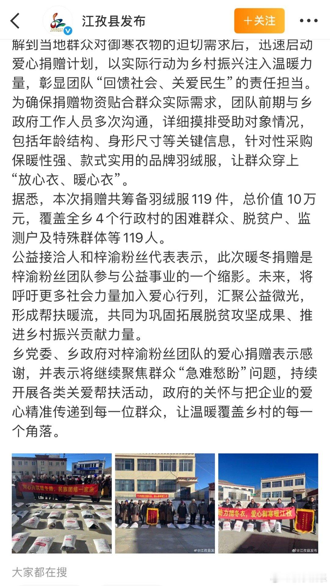 梓渝粉丝又在做公益啦,为老人困难群众和留守儿童送上了冬衣,好有爱,跟着梓渝一起做