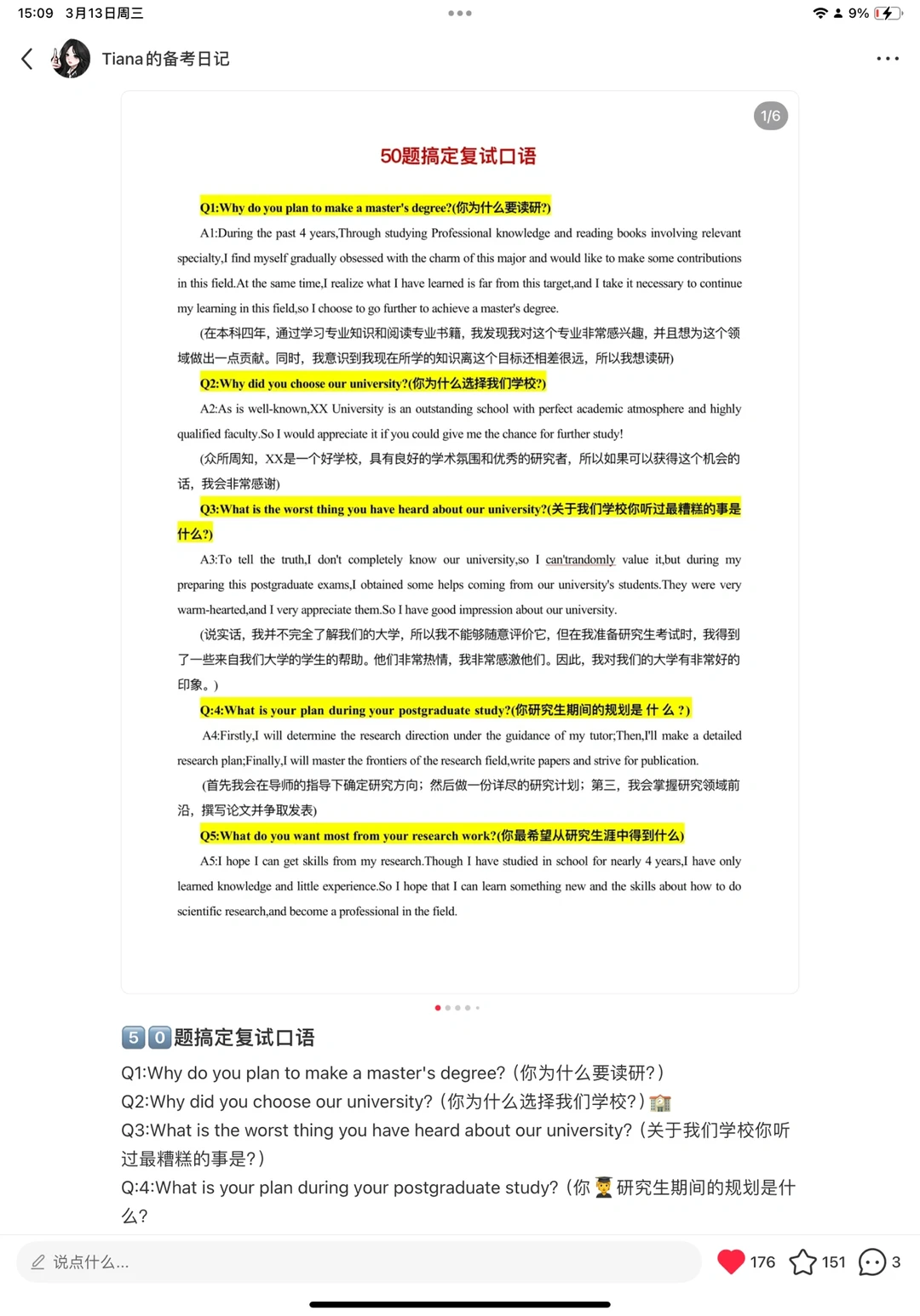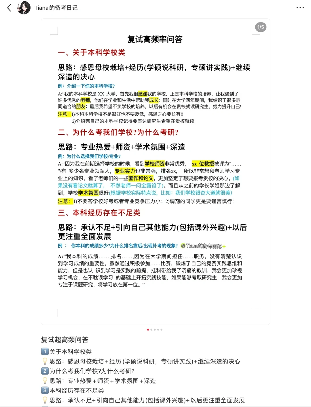 • 根据复试时间安排3次模拟面试,和专业课一块。模拟面试如果没有专业的老师或者学长学姐,找同样准备复试的同学也可以。