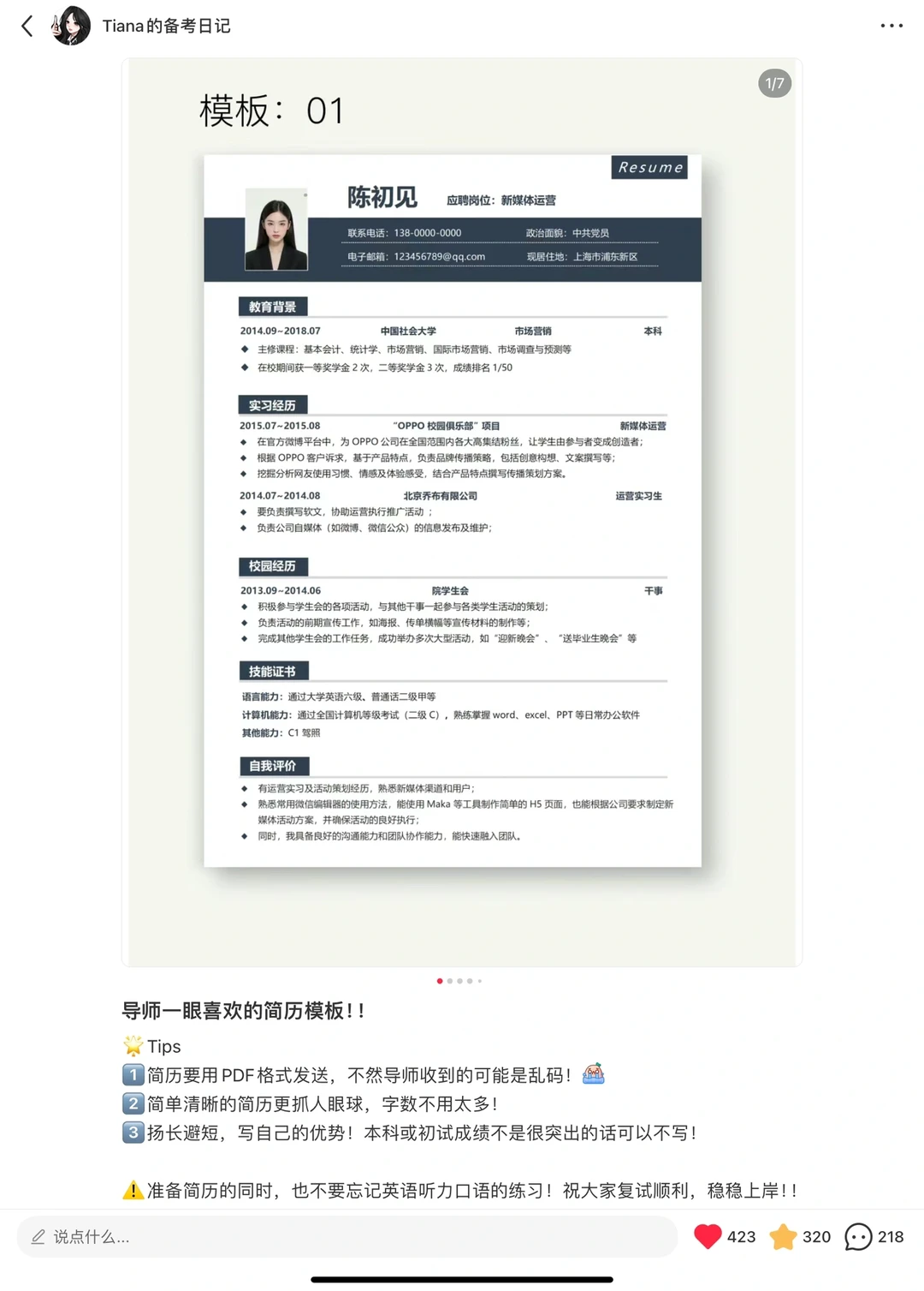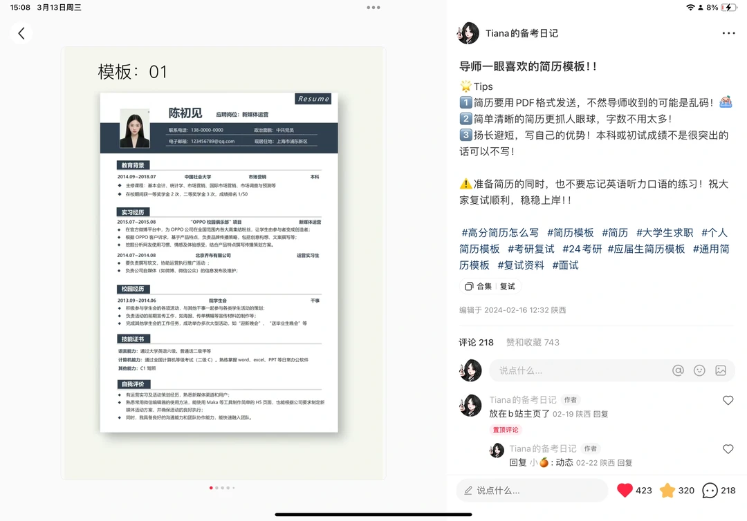 • 准备复试简历(大多数院校都会要求带简历。即便没有明确要求,只要不是匿名复试,准备好带上肯定是加分项,前面有分享简历模板,大家可以直接修改)