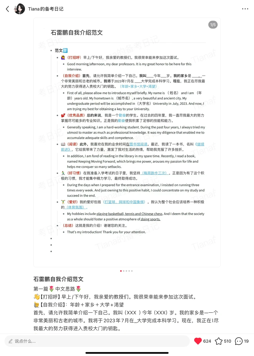 • 准备并背诵中英文自我介绍(中英文都背诵!老师用啥语言提问就用啥回答,之前发过~)