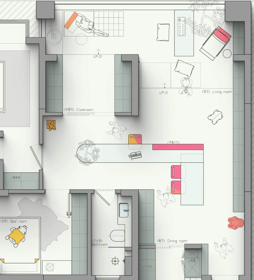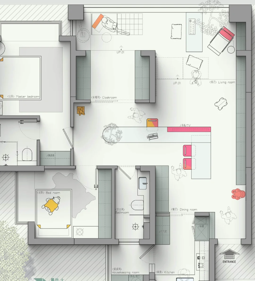 设计需求: 目前新婚夫妇两人 1、主卧、衣帽间(最好能有)、主卫 2、未来小孩房(能放得下书桌) 3、书房(偶尔在家办公) 4、封闭式厨房 想要有趣不一样的设计
