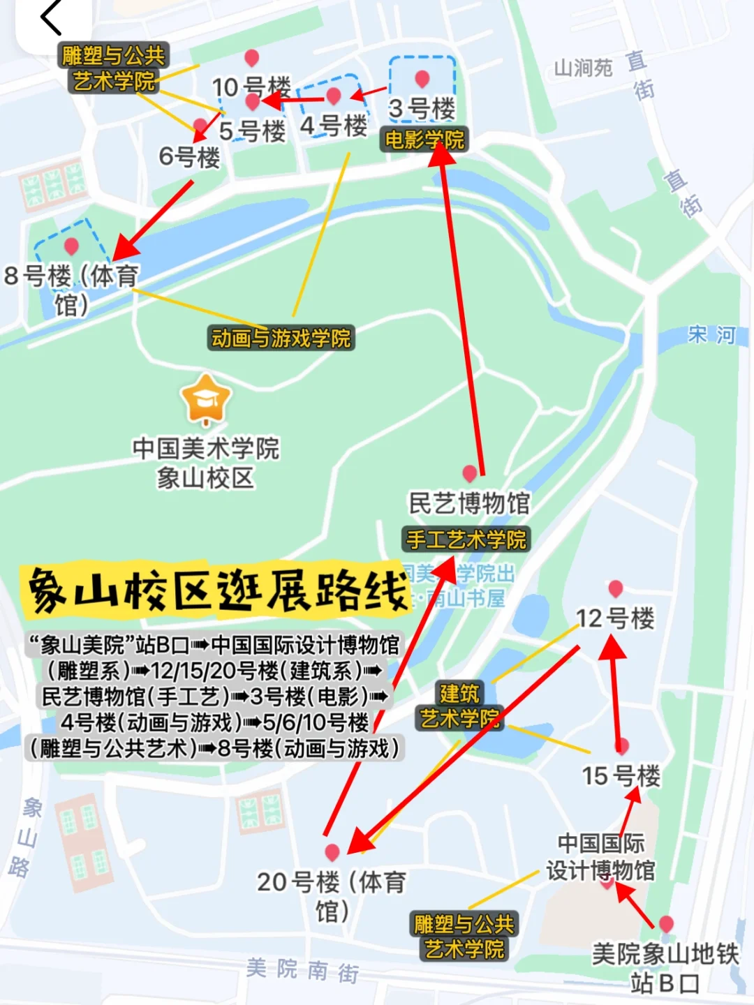 美院象山B口➡️国际设计博物馆(雕塑与公共艺术)➡️12/15/20号楼(建筑艺术)➡️民艺博物馆(手工艺术)➡️3号楼(电影学院)➡️4号楼(动画与游戏)➡️5/6/10号楼(雕塑与公共艺术)➡️8号楼体育馆(动画与游戏)