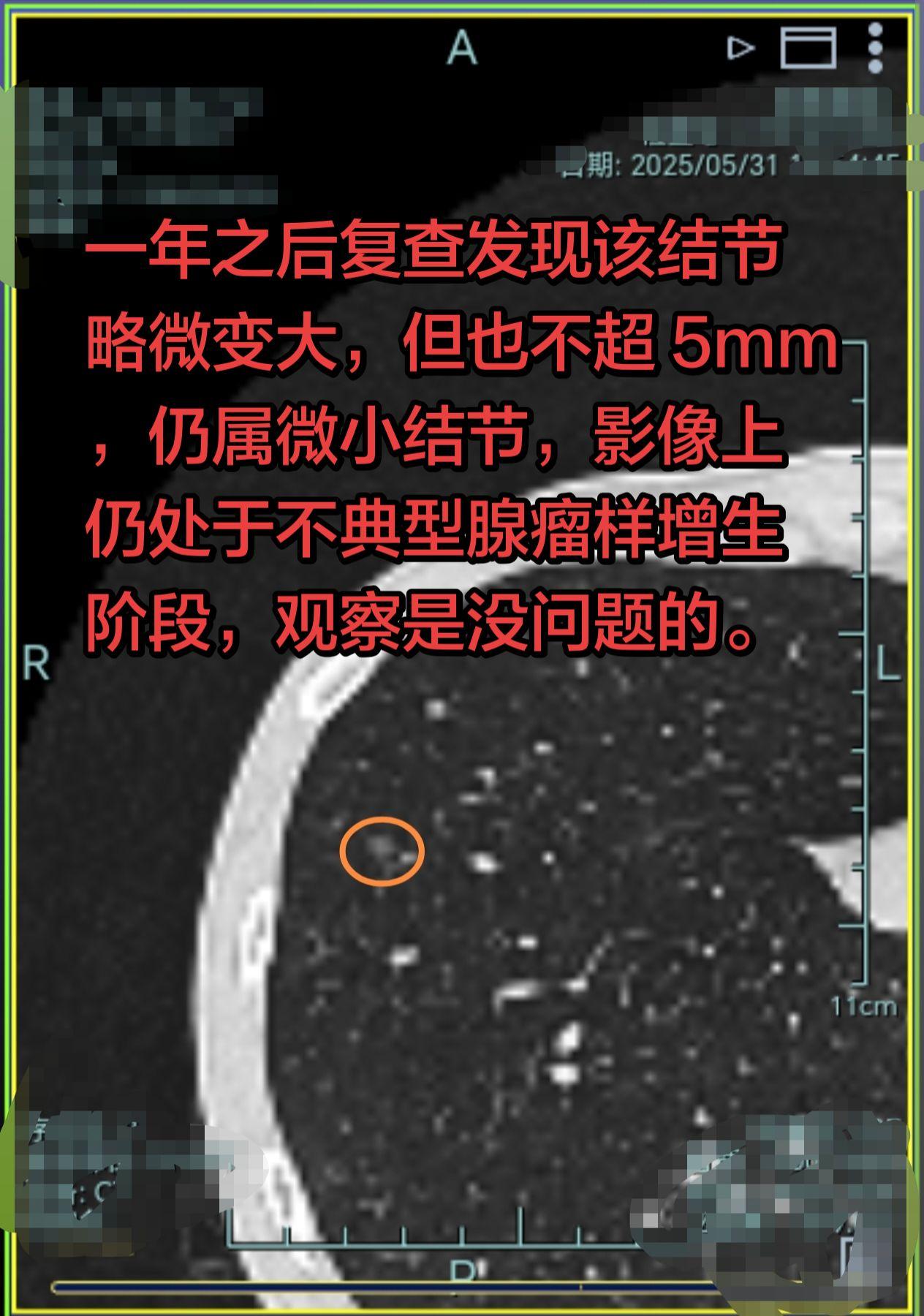 微小纯磨玻璃结就需要手术?一年半前发现右下肺微小纯结节,结节边缘清晰,仅从特征上看不典型腺瘤样增生可能性大,对于此类结节最佳的管理策略是观察,一年之后复查。一年之后复查发现该结节略微变大,但也不超 5mm,仍属微小结节,影像上仍处于不典型腺瘤样增生阶段,观察是没问题的。但患者就医却建议手术切除,此类情况有可能是患者当时过于焦虑,担心结节快速恶变,而医生又不能 100% 确定后续一定就没问题而给出的防御性建议。但无论如何,该类结节仍然可放心观察,短时间内一般不会快速进展。
