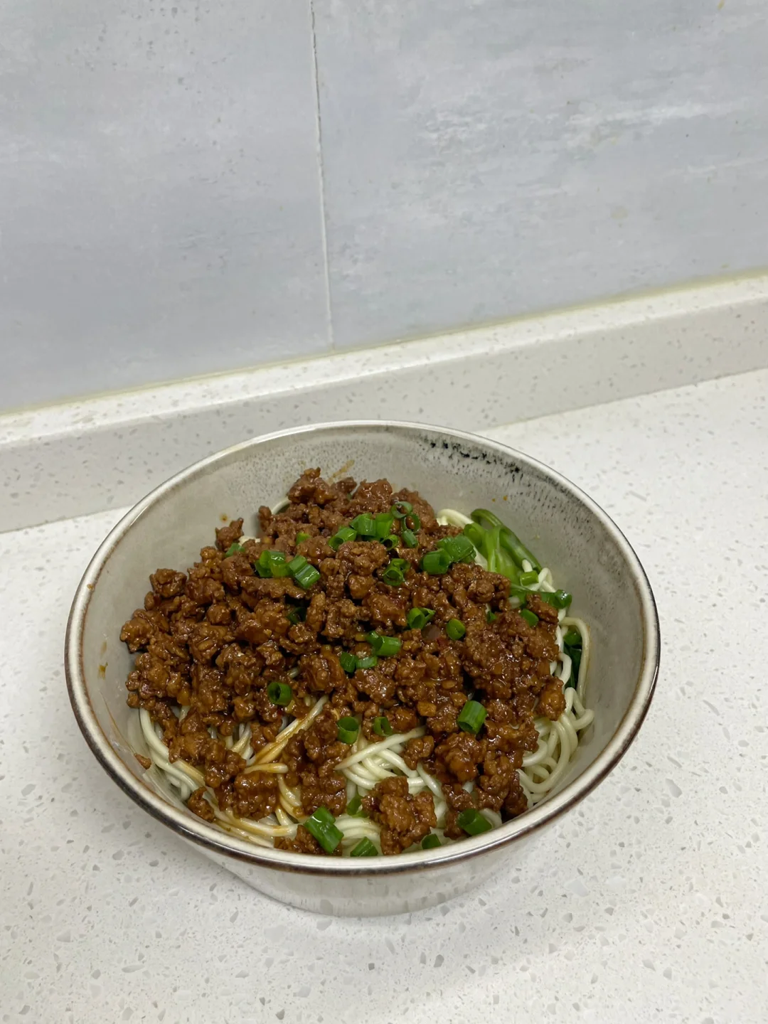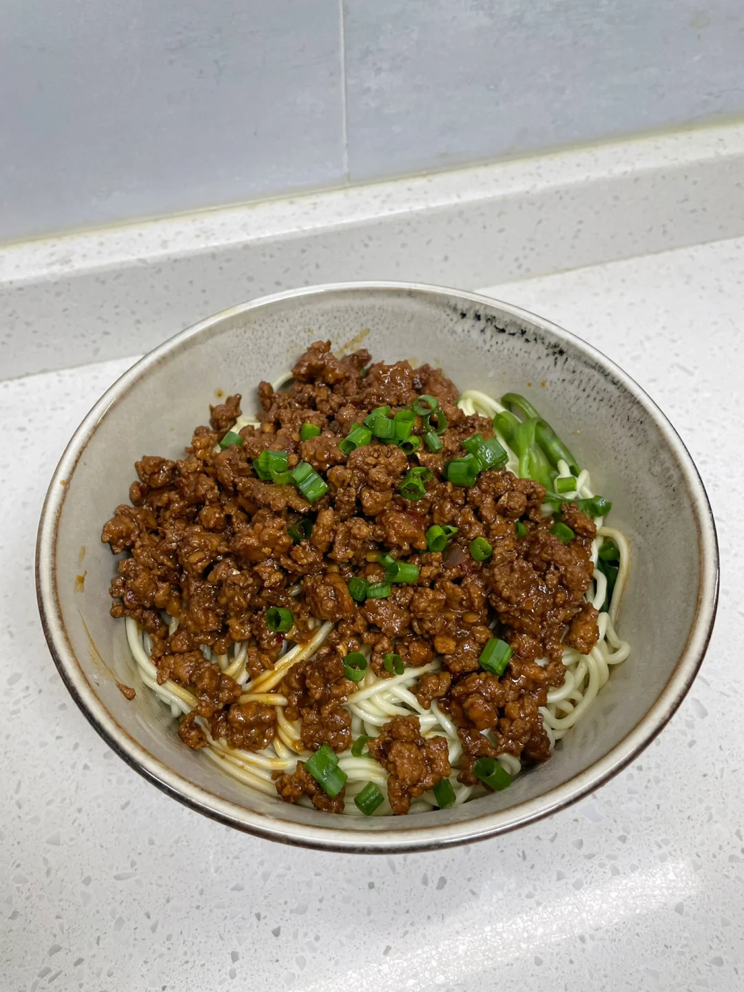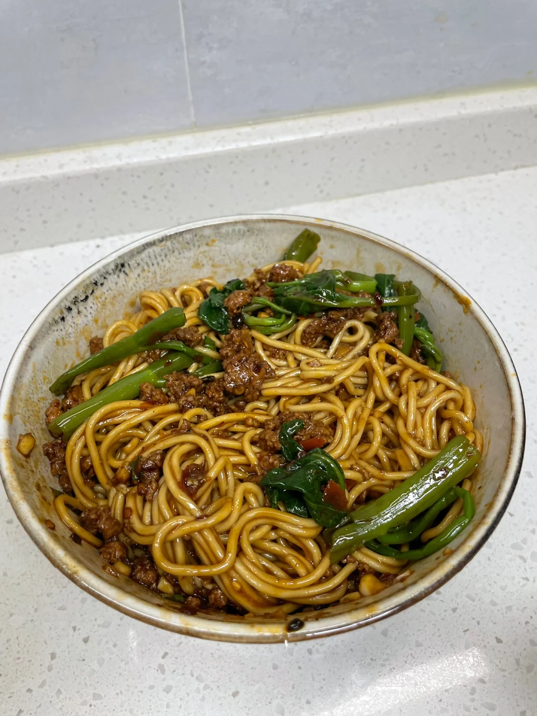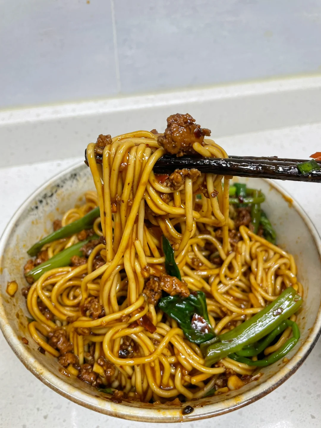 重庆人不可错过的干馏杂酱面,麻辣鲜香,根根面条裹满了料,超爽超过瘾~ 食材:碱水面 梅花肉 空心菜 配料:生抽 老抽 姜末 豆瓣酱 甜面酱 胡椒粉 鸡精 小面调料:盐 生抽 白糖 花椒面 油辣椒 蒜末 1⃣️:梅花肉剁碎下锅炒散,加入姜末炒香,加入一小勺豆瓣酱 半勺生抽老抽 一勺甜面酱 少许胡椒粉和一勺鸡精炒匀,加一碗水煮开至收汁 2⃣️:水开放入空心菜煮熟捞出,再放入面条煮开,加入一碗凉水再次煮开后捞出,加上炒好的杂酱肉末,撒葱花拌匀即可