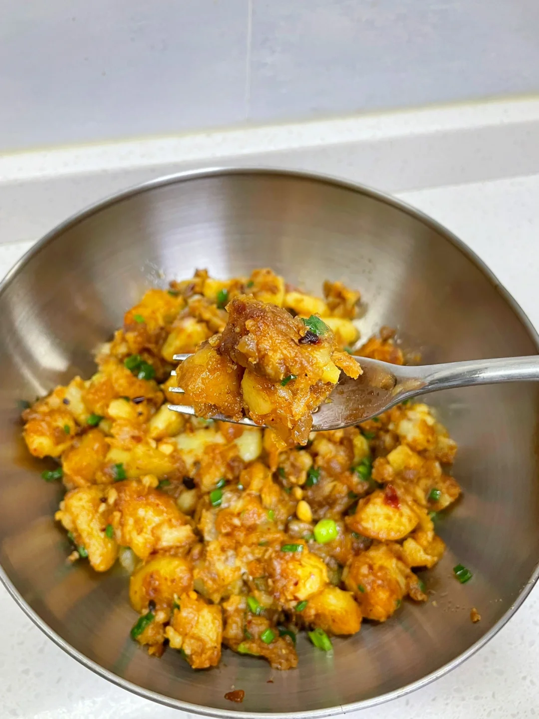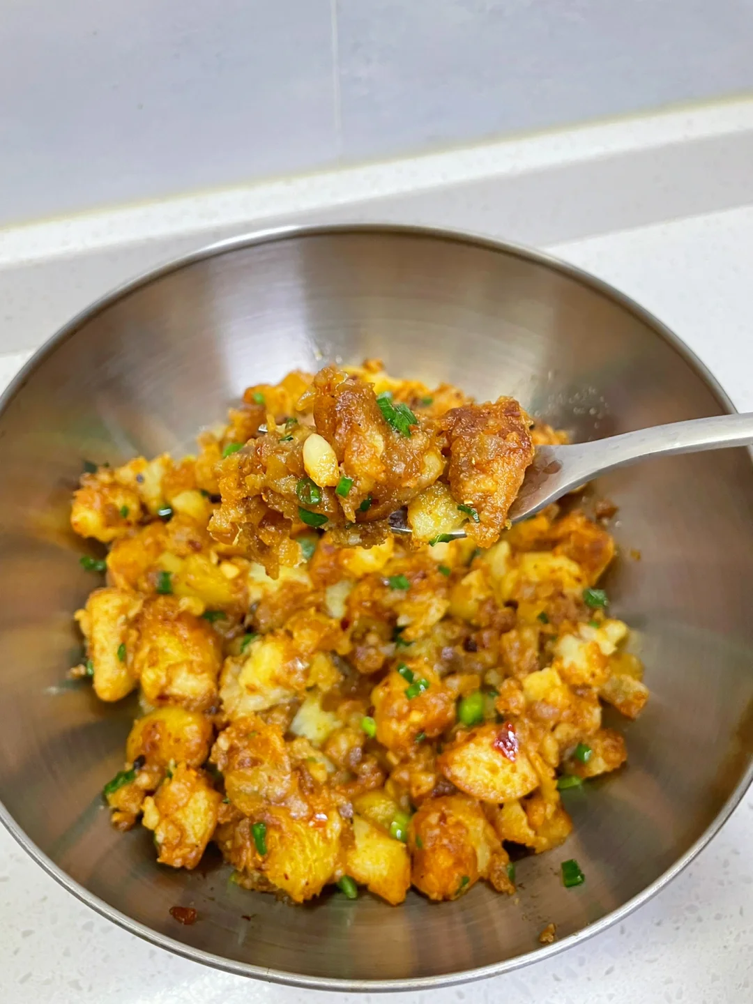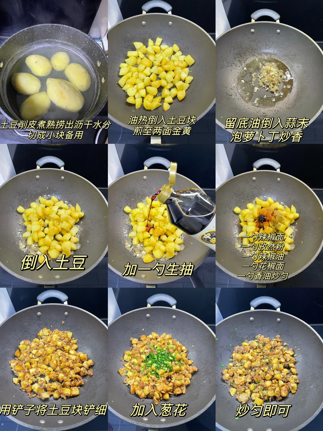2⃣️:锅中油热放入土豆块煎至两面金黄捞出,锅中留底油,倒入泡萝卜丁和蒜末炒香,再倒入土豆块,加一勺酱油 一勺盐 一勺孜然粉 一勺辣椒面 一勺花椒面 一勺辣椒油 一勺香油炒匀,再用铲子把土豆捣碎一些更入味,最后加葱花炒匀即可