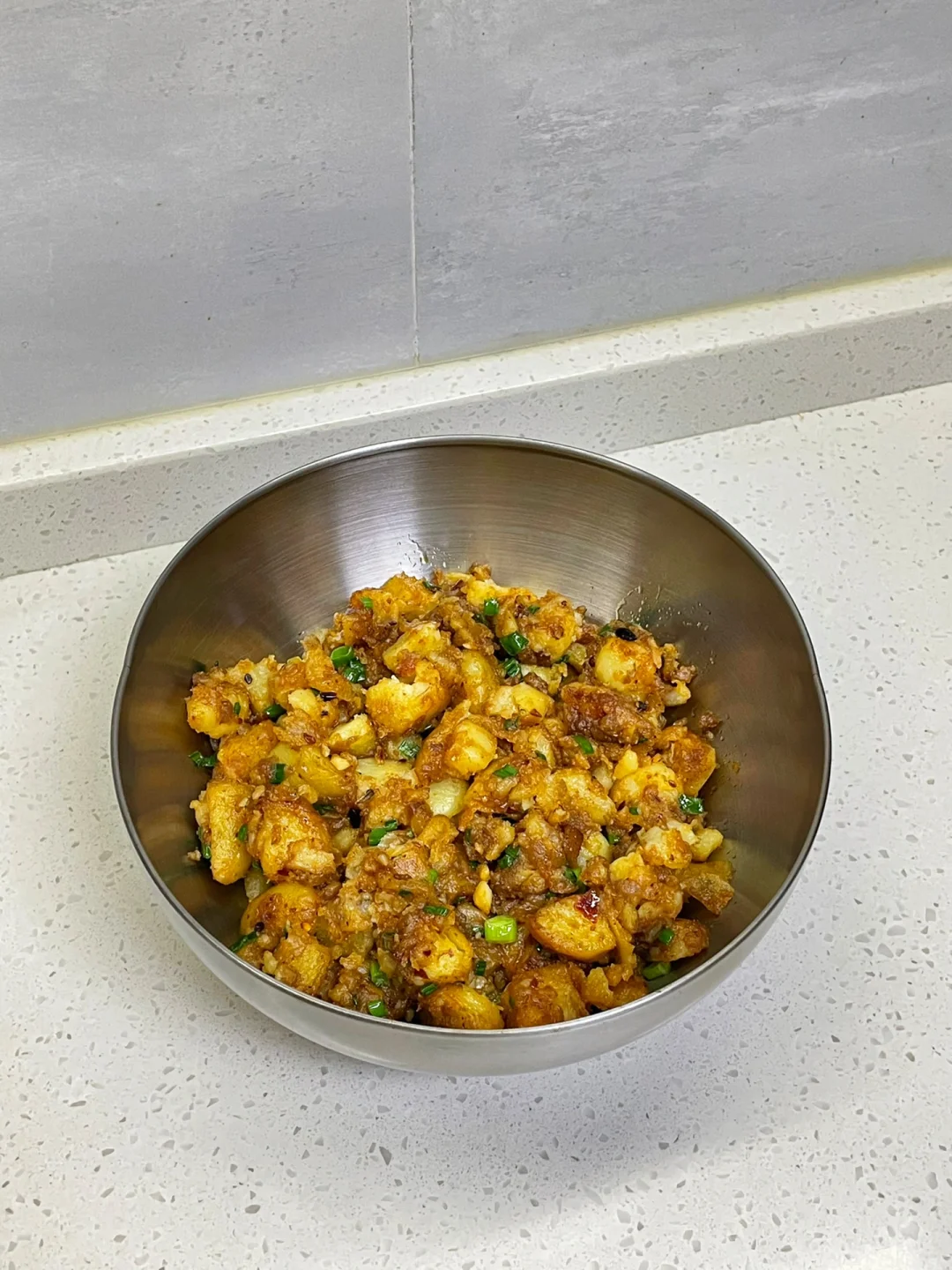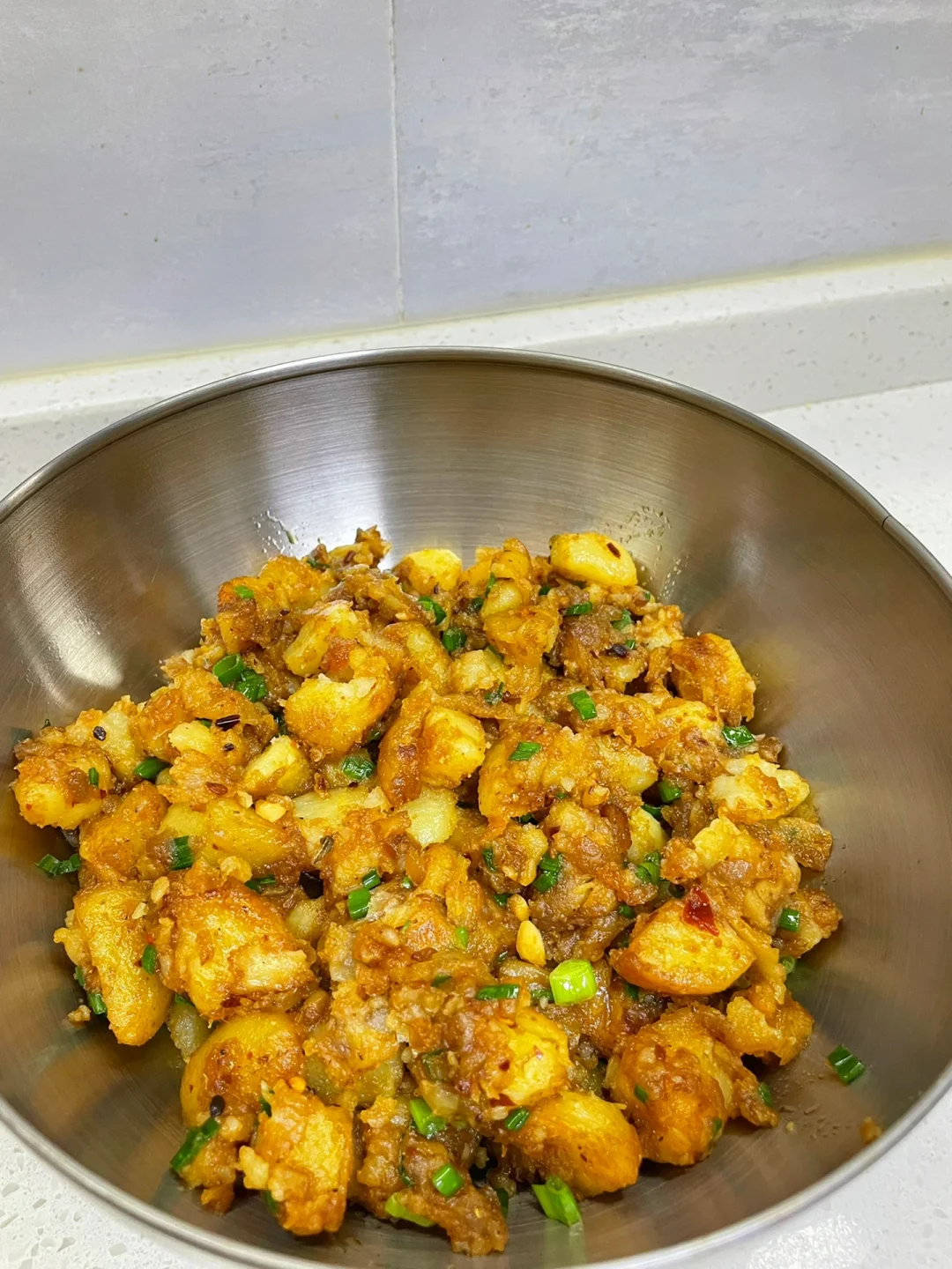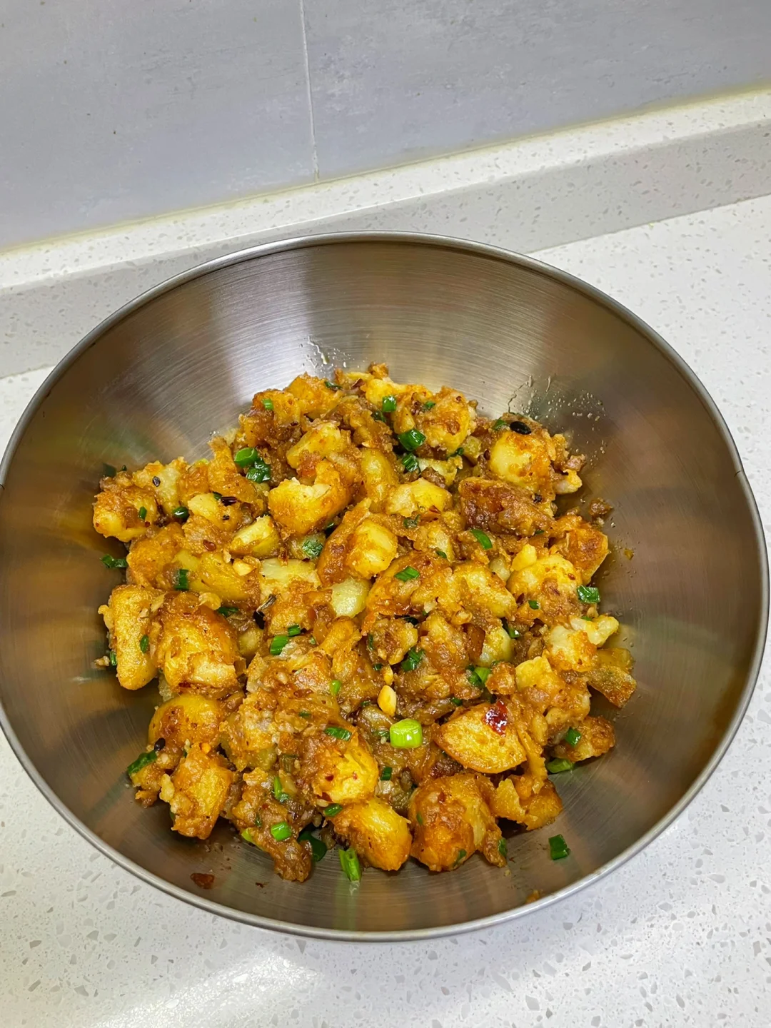 2⃣️:锅中油热放入土豆块煎至两面金黄捞出,锅中留底油,倒入泡萝卜丁和蒜末炒香,再倒入土豆块,加一勺酱油 一勺盐 一勺孜然粉 一勺辣椒面 一勺花椒面 一勺辣椒油 一勺香油炒匀,再用铲子把土豆捣碎一些更入味,最后加葱花炒匀即可