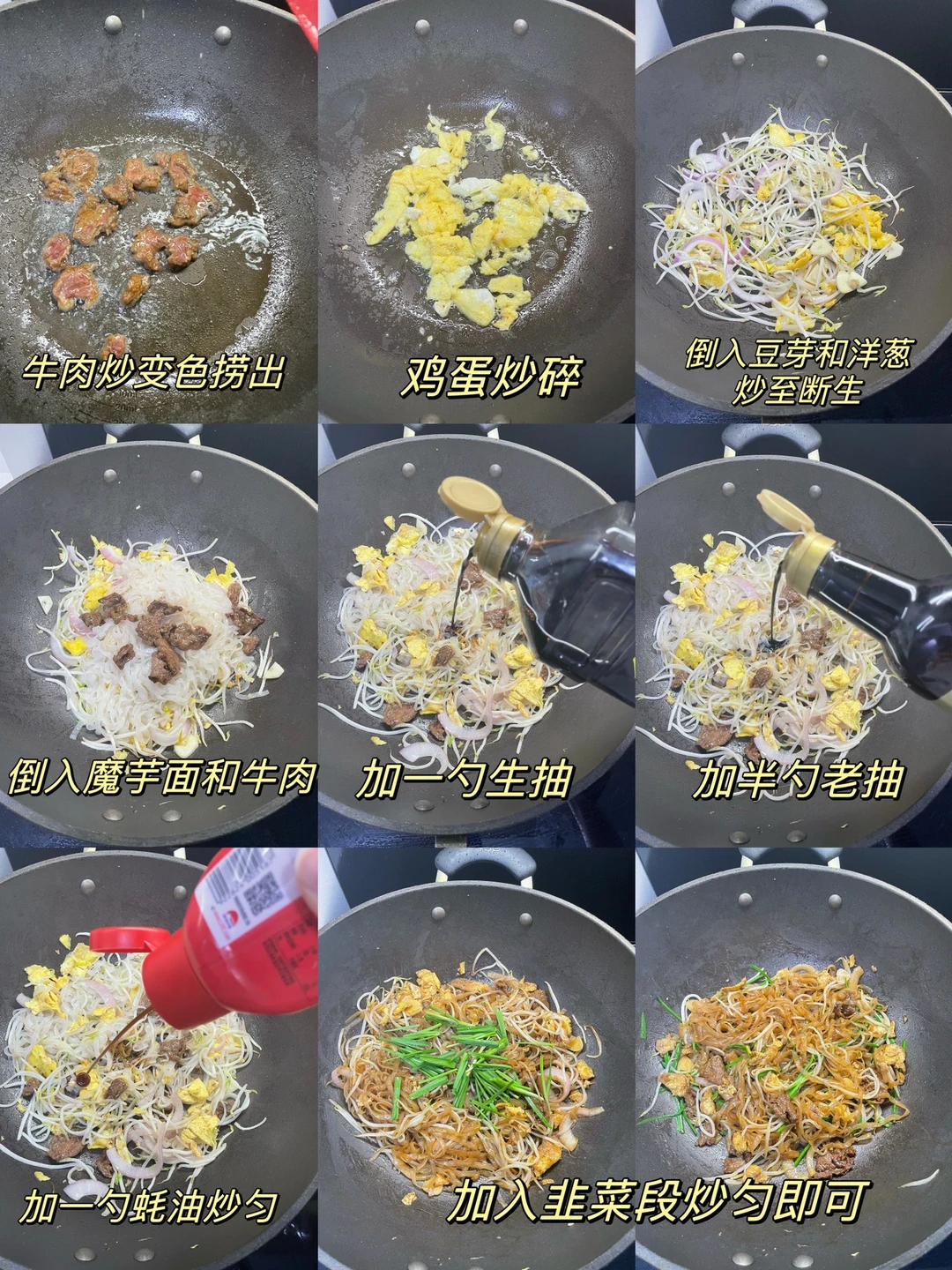 2⃣️:油热放入牛肉炒变色捞出,倒入鸡蛋炒碎,倒入姜蒜末和洋葱豆芽炒至断生,倒入魔芋面和牛肉,加一勺生抽,半勺老抽,一勺蚝油炒匀,最后加韭菜段炒匀即可