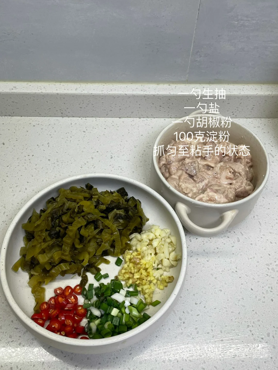 酸菜滑肉汤也太开胃了吧,肉片又嫩又入味,汤汁泡饭绝绝子~ 食材:梅花肉 酸菜 配料:葱姜蒜 生抽 胡椒粉 盐 花椒面 淀粉 小米辣 1⃣️:酸菜切碎,小米辣切圈圈 葱花 姜蒜末切好备用,梅花肉洗净切薄片加一勺生抽 一勺盐 一勺胡椒粉 100克淀粉 少量清水抓匀至粘手状态 2⃣️:锅中油热放入姜蒜末和酸菜炒香,超值酸菜发白加入一瓢水烧开,加一勺胡椒粉 半勺盐 半勺花椒面继续煮5分钟,转小火放入肉片,中途不要翻动,煮定型后轻轻推动肉片以免粘锅,肉片煮熟后放入小米辣,出锅撒上葱花即可
