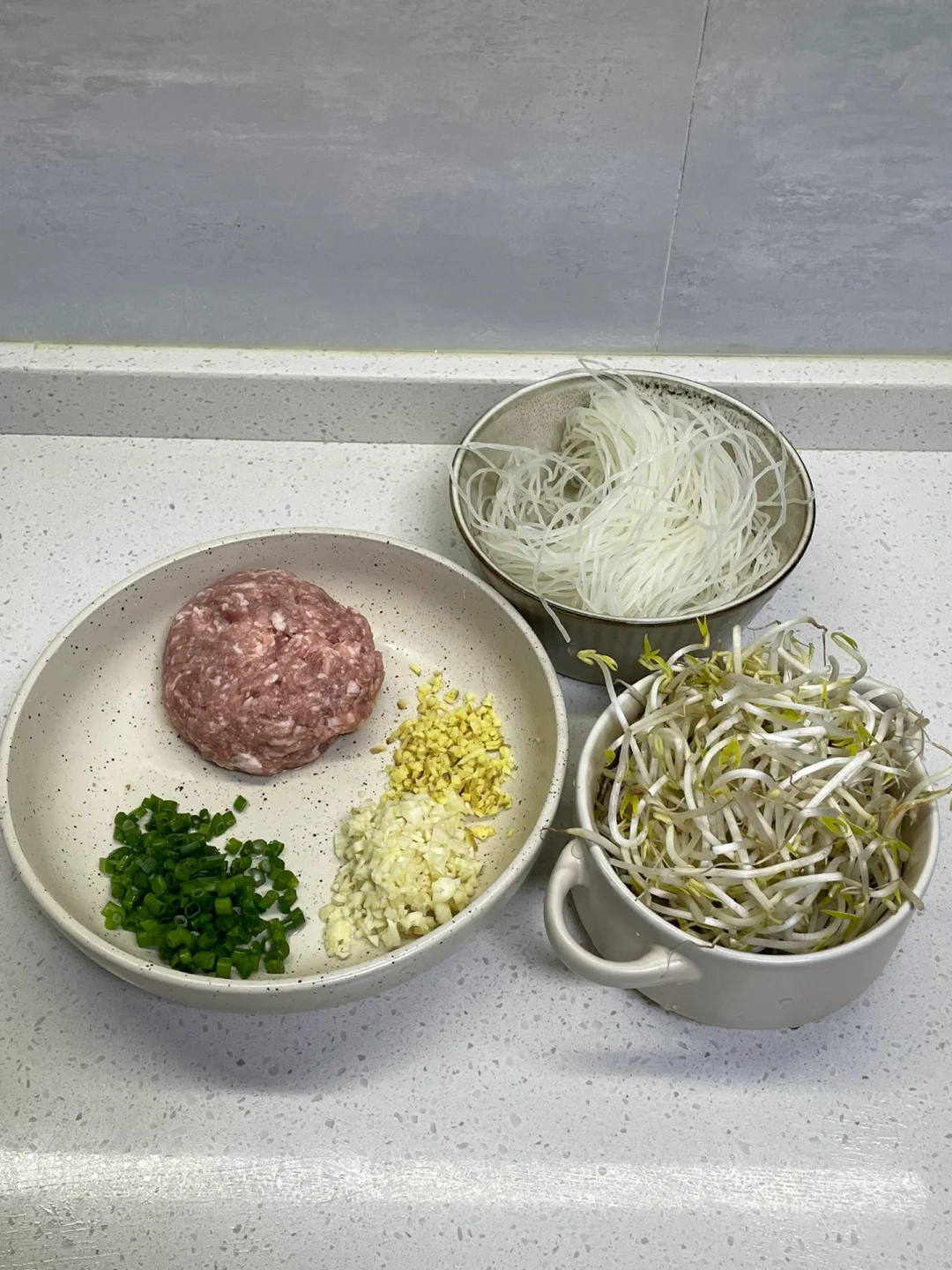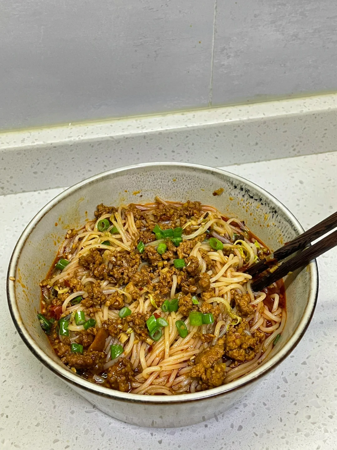3⃣️:豆芽和米线煮熟捞出放入碗中,加上杂酱肉末,撒点葱花即可