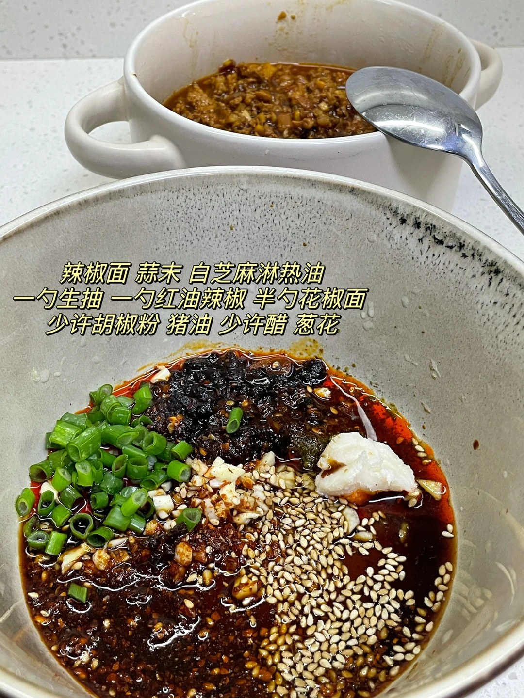 2⃣️:碗中加入一勺辣椒面 一勺白芝麻 一勺蒜末淋热油即发香味,再加一勺红油辣椒 一勺生抽 半勺胡椒粉 半勺花椒粉 一小坨猪油 葱花 半勺醋 水开加半碗水