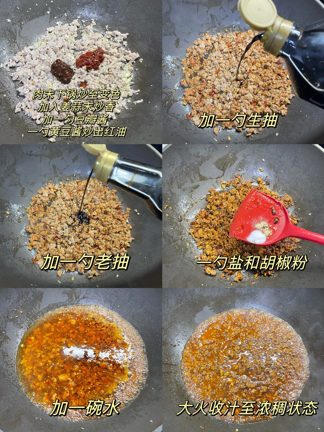 1⃣️:梅花肉搅碎下锅炒至变色,加入姜蒜末炒香,加一勺豆瓣酱和黄豆酱炒出红油,加一勺生抽 一勺老抽炒匀,加一碗水煮至浓稠即可