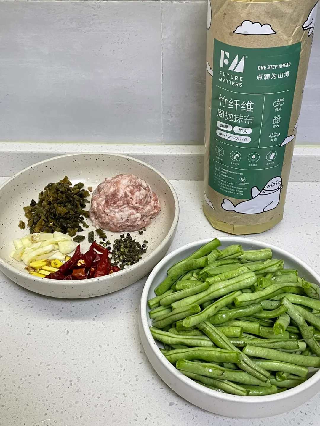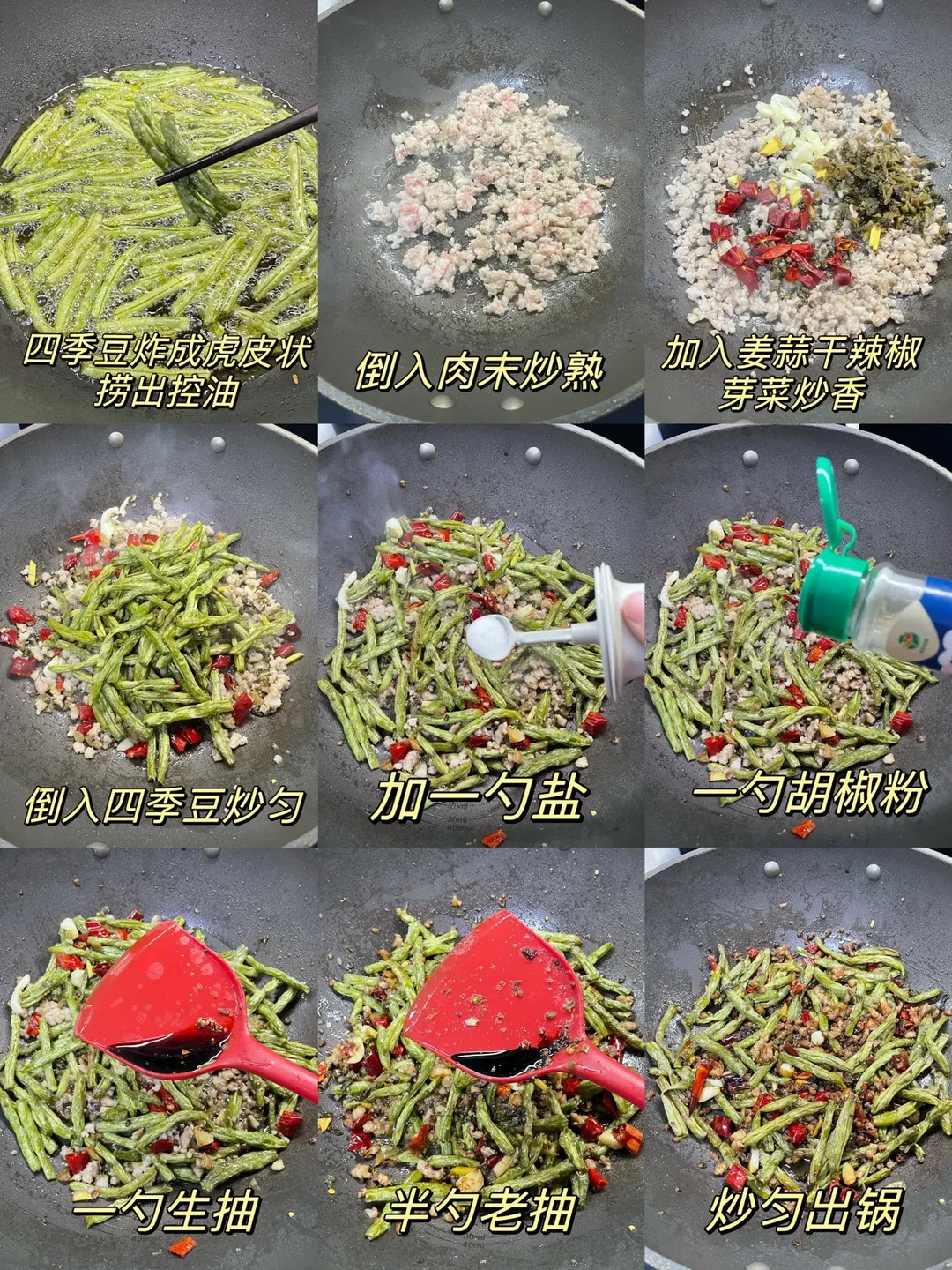 1⃣:四季豆洗净控干水分,梅花肉切末,芽菜切碎,油热倒入四季豆炸至虎皮状态捞出控油