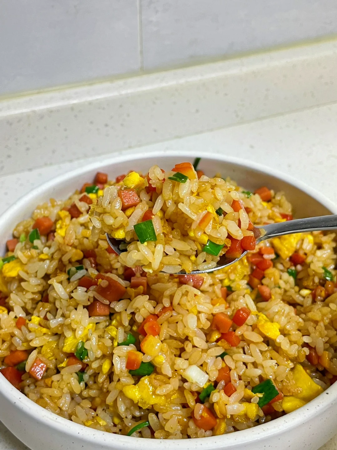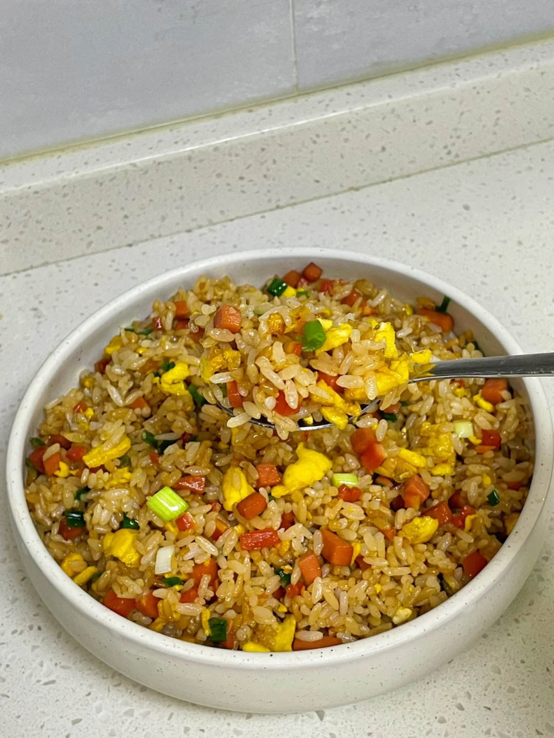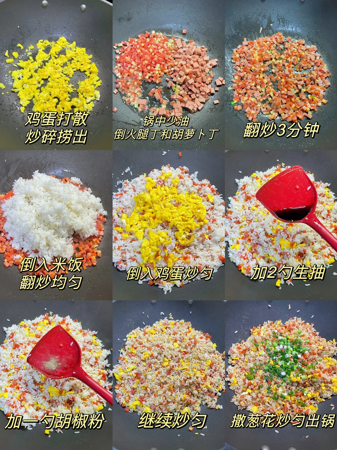 蛋炒饭这样做也太好吃了,家里有剩饭的一定要试试,做法简单超有食欲~ 食材:隔夜饭 鸡蛋 火腿肠 胡萝卜 配料:葱花 生抽 胡椒粉 1⃣️:鸡蛋打散炒碎,火腿和胡萝卜切丁,小葱切成葱蒜备用 2⃣️:锅中加少许油,倒入火腿和胡萝卜翻炒至胡萝卜断生,倒入米饭炒散,再倒入鸡蛋炒匀,加2勺生抽 一勺胡椒粉调味,出锅前撒葱花炒匀即可 调料根据米饭多少可适量增减