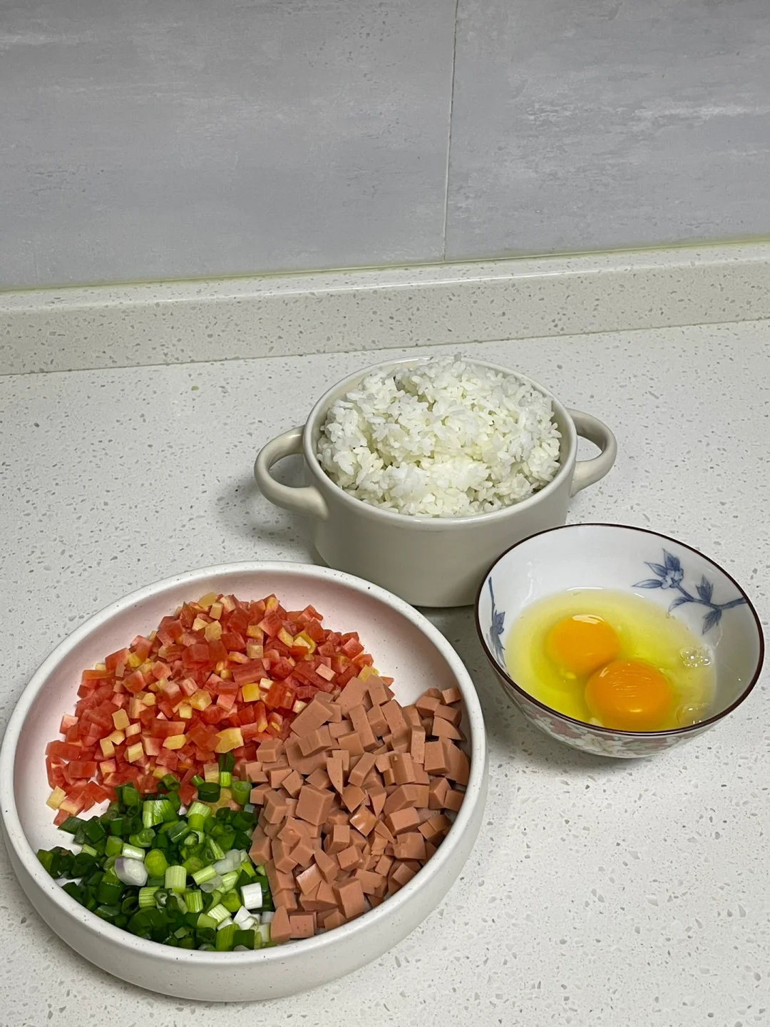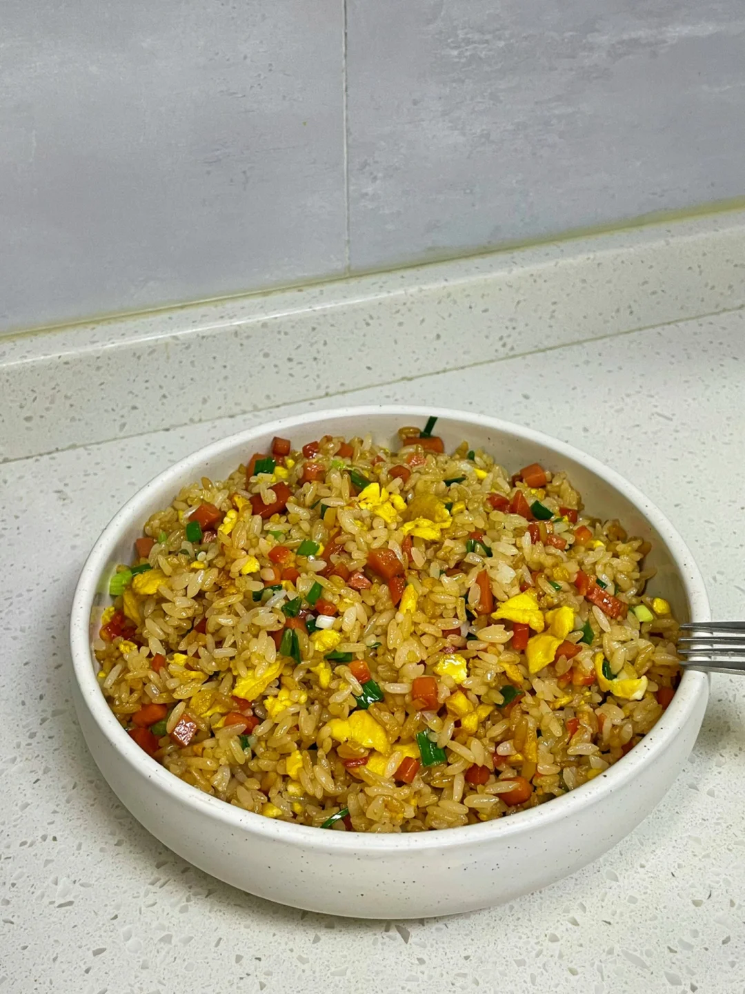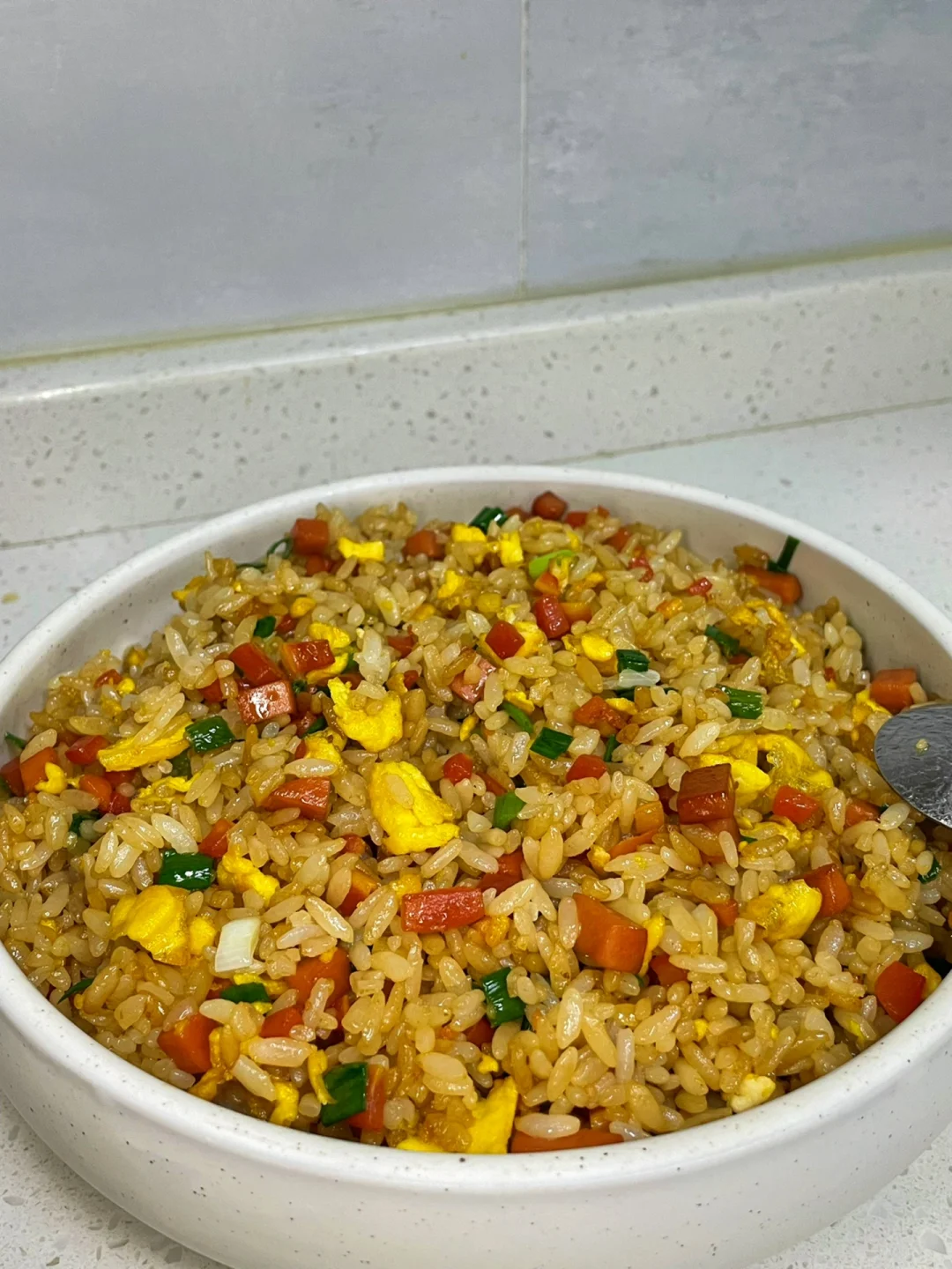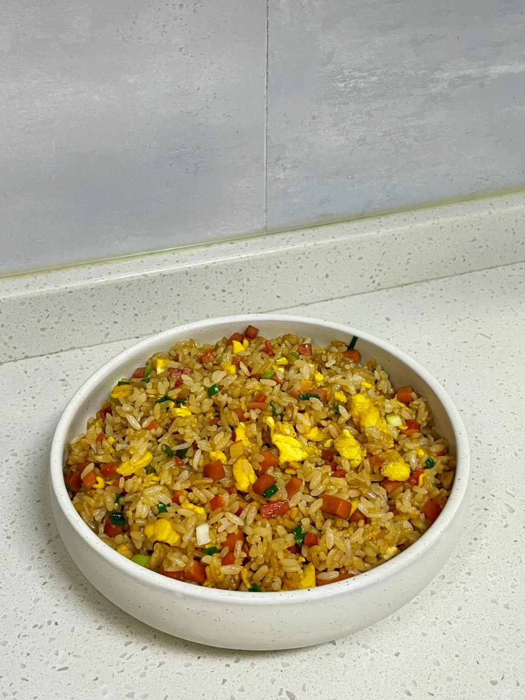 蛋炒饭这样做也太好吃了,家里有剩饭的一定要试试,做法简单超有食欲~ 食材:隔夜饭 鸡蛋 火腿肠 胡萝卜 配料:葱花 生抽 胡椒粉 1⃣️:鸡蛋打散炒碎,火腿和胡萝卜切丁,小葱切成葱蒜备用 2⃣️:锅中加少许油,倒入火腿和胡萝卜翻炒至胡萝卜断生,倒入米饭炒散,再倒入鸡蛋炒匀,加2勺生抽 一勺胡椒粉调味,出锅前撒葱花炒匀即可 调料根据米饭多少可适量增减