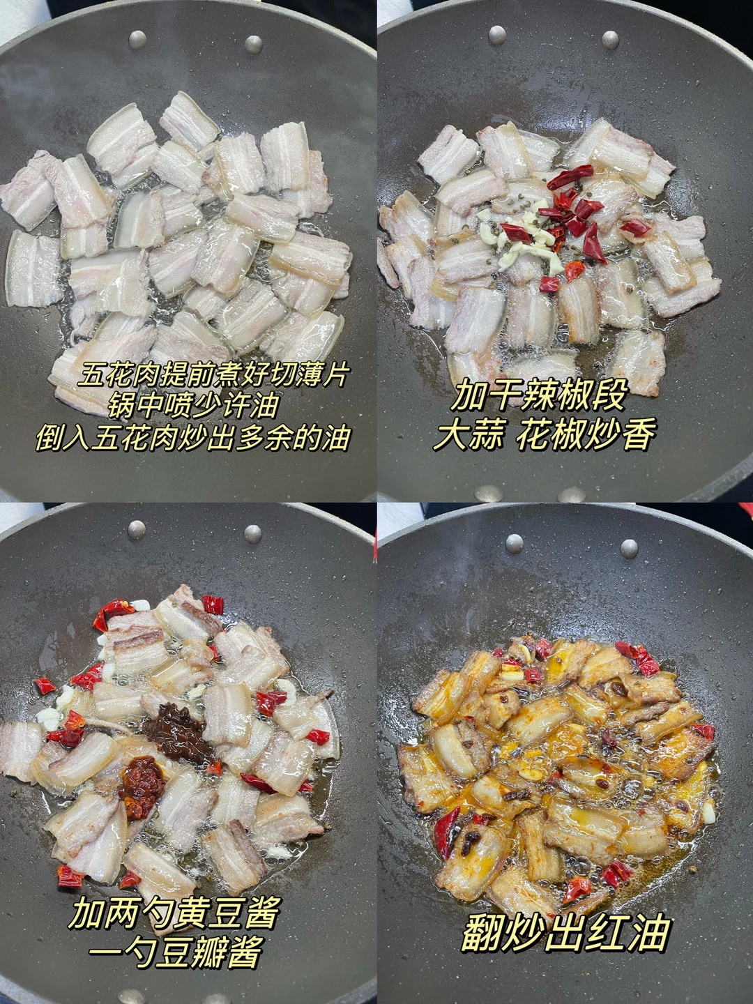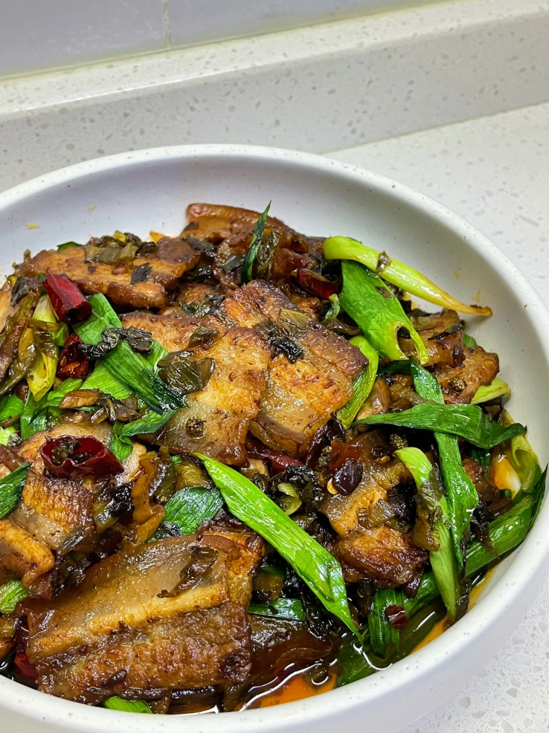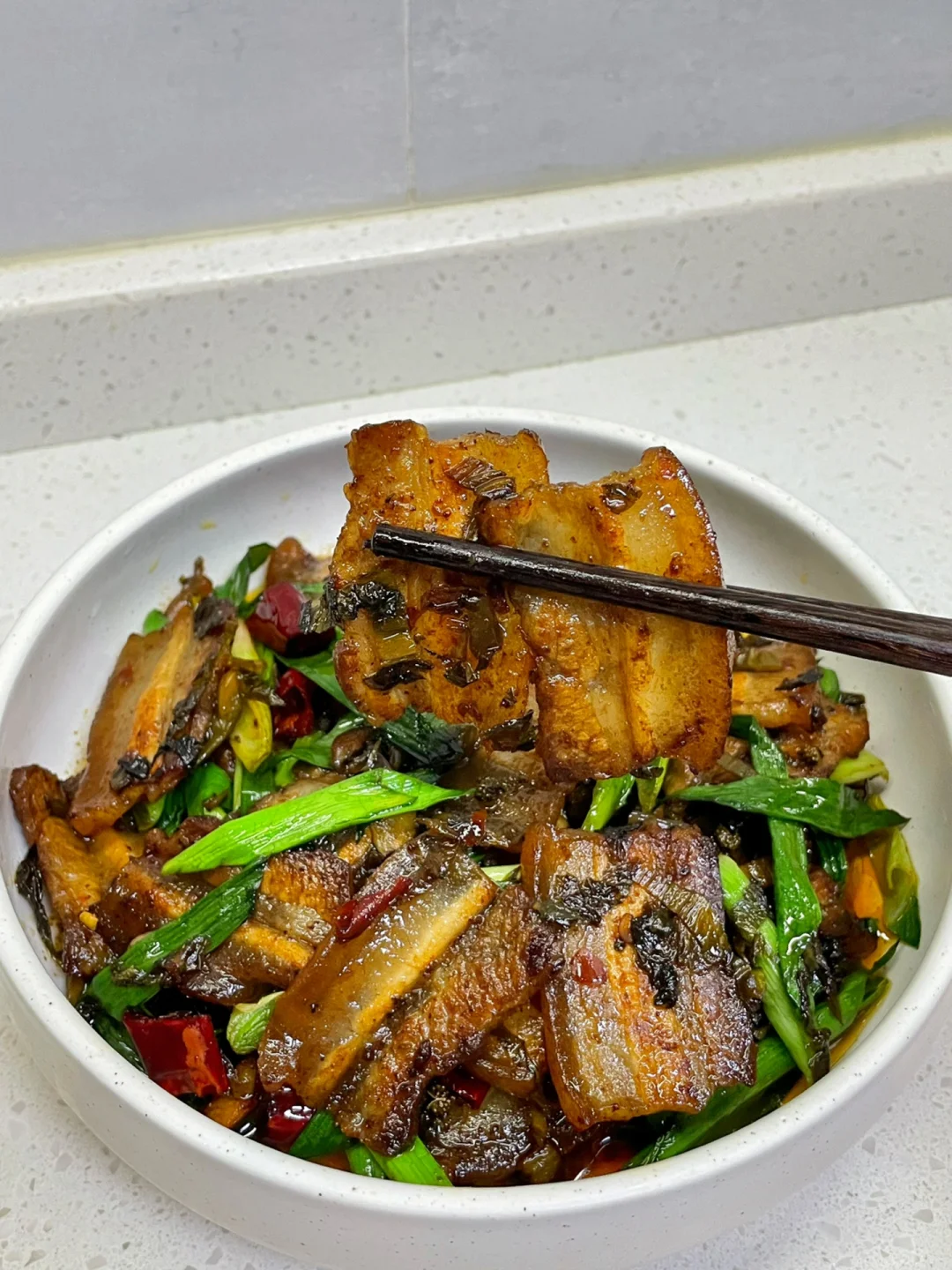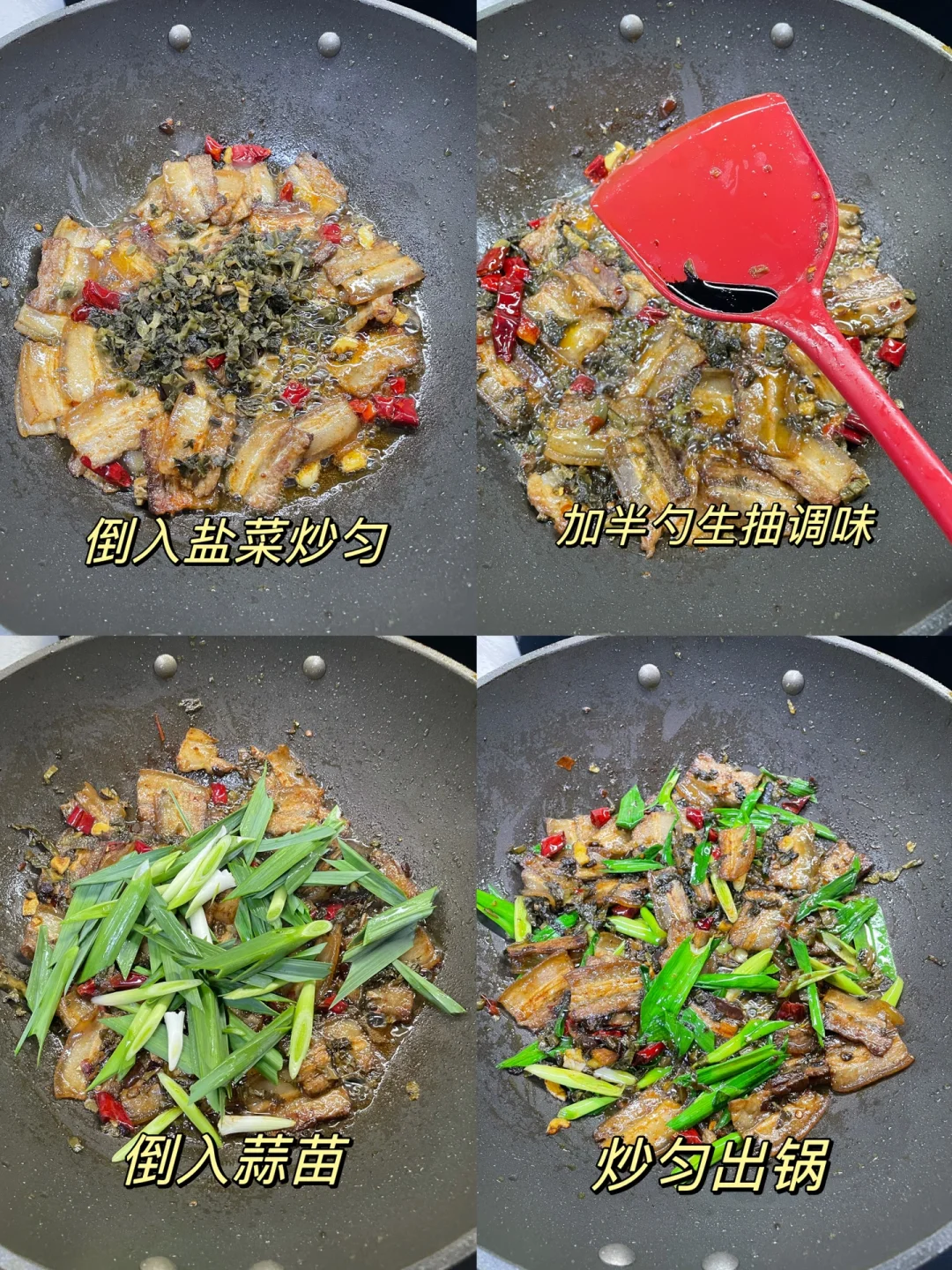 加了老盐菜的回锅肉也太下饭了,焦香入味的五花肉肥而不腻,和米饭太配了~ 食材:五花肉 蒜苗 盐菜 配料:干辣椒 干花椒 大蒜 生抽 豆瓣酱 黄豆酱 1⃣️:五花肉冷水下锅加葱姜煮熟捞出切薄片,干辣椒切段,大蒜切碎,蒜苗斜着切段,盐菜切碎后多次清洗挤干水分 2⃣️:锅中少油,倒入五花肉炒出多余的油,倒入花椒 辣椒 大蒜炒香,再加两勺黄豆酱 一勺豆瓣酱炒出红油,倒入盐菜炒香,加半勺生抽调味,出锅前加蒜苗炒匀即可