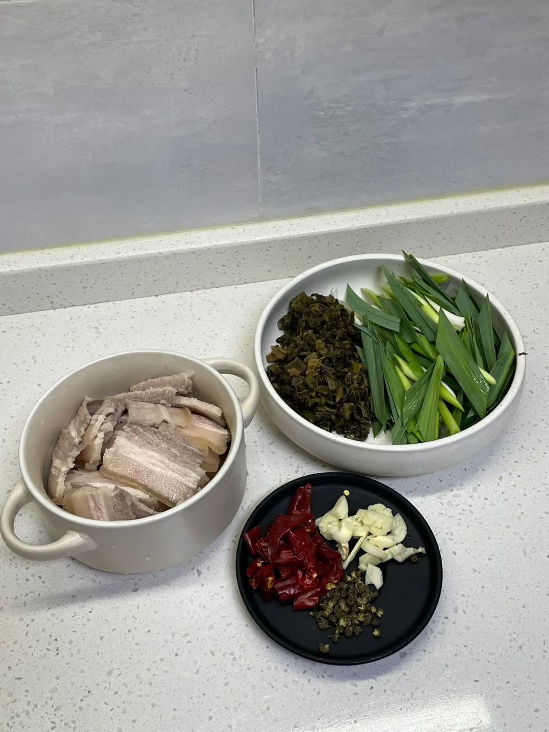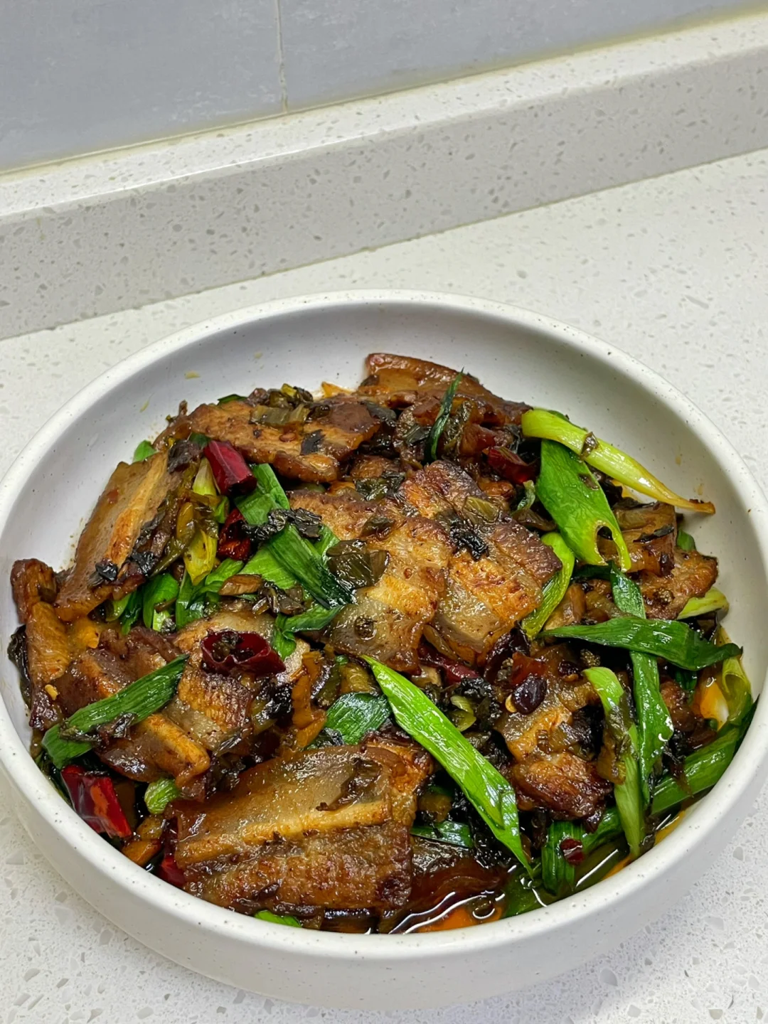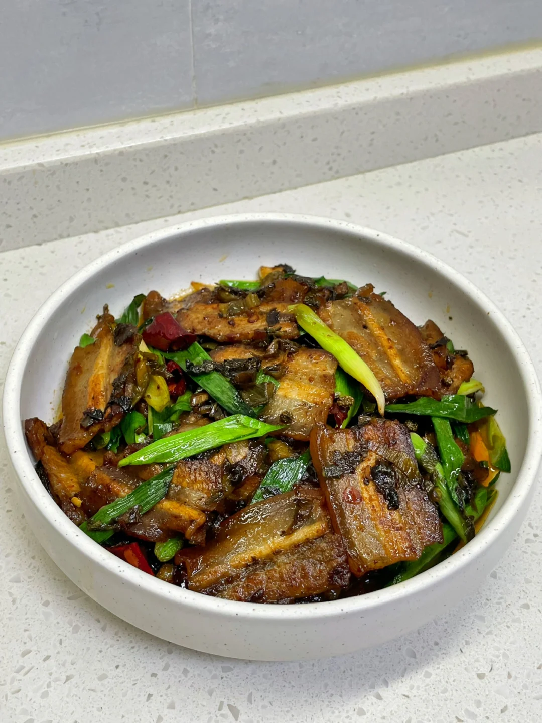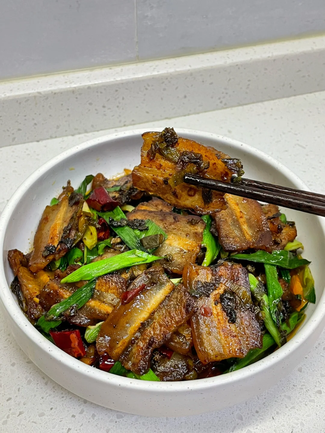 加了老盐菜的回锅肉也太下饭了,焦香入味的五花肉肥而不腻,和米饭太配了~ 食材:五花肉 蒜苗 盐菜 配料:干辣椒 干花椒 大蒜 生抽 豆瓣酱 黄豆酱 1⃣️:五花肉冷水下锅加葱姜煮熟捞出切薄片,干辣椒切段,大蒜切碎,蒜苗斜着切段,盐菜切碎后多次清洗挤干水分 2⃣️:锅中少油,倒入五花肉炒出多余的油,倒入花椒 辣椒 大蒜炒香,再加两勺黄豆酱 一勺豆瓣酱炒出红油,倒入盐菜炒香,加半勺生抽调味,出锅前加蒜苗炒匀即可