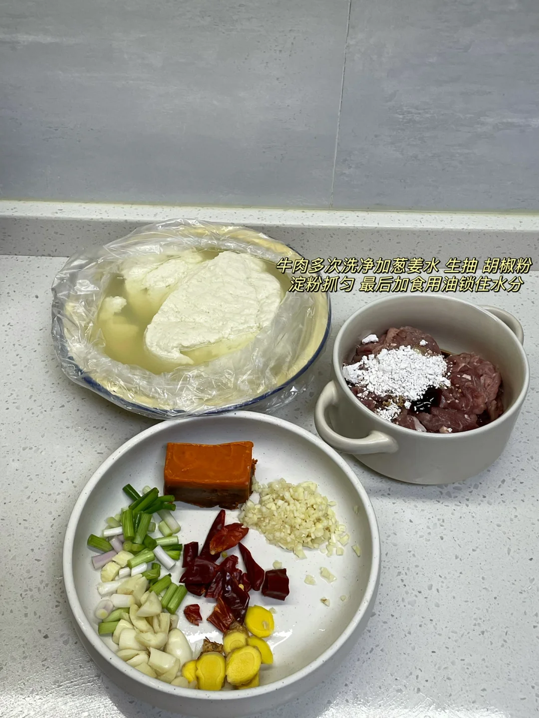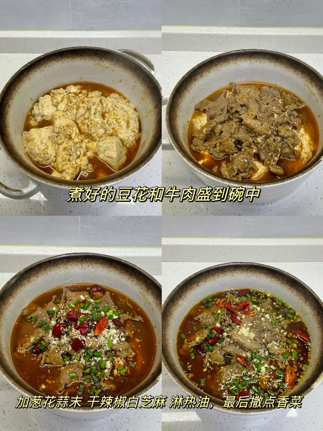 川菜yyds,香香辣辣的水煮豆花牛肉,一口封神,超级无敌好吃~ 食材:豆花 牛肉 配料:葱花 蒜末 姜 火锅底料 香菜 干辣椒 花椒 生抽 胡椒粉 淀粉 盐 白糖 1⃣️:牛肉切薄片,多次清洗挤干水分,加一勺生抽 一勺胡椒粉 三勺淀粉 葱姜水抓匀 再加食用油抓匀锁水 2⃣️:锅中油热放入葱姜蒜炒香,加入火锅底料炒化,加水再加两勺盐 一勺胡椒粉 半勺白糖,水开后转小火放入牛肉,牛肉煮熟捞出,倒入豆花多煮一会儿,煮入味后捞出,再倒入牛肉,加干辣椒 花椒 葱花蒜末和白芝麻淋上热油,最后加点香菜即可