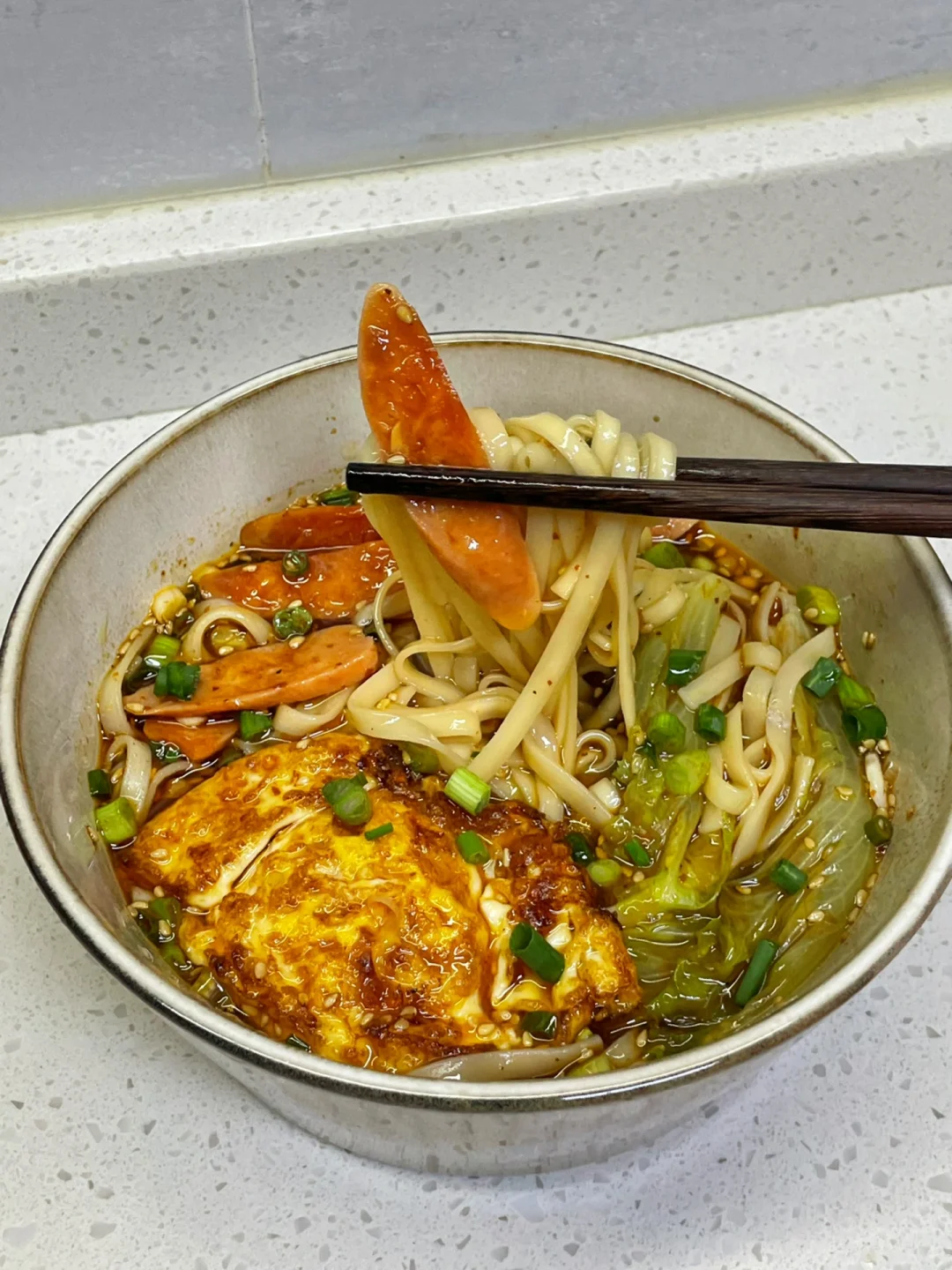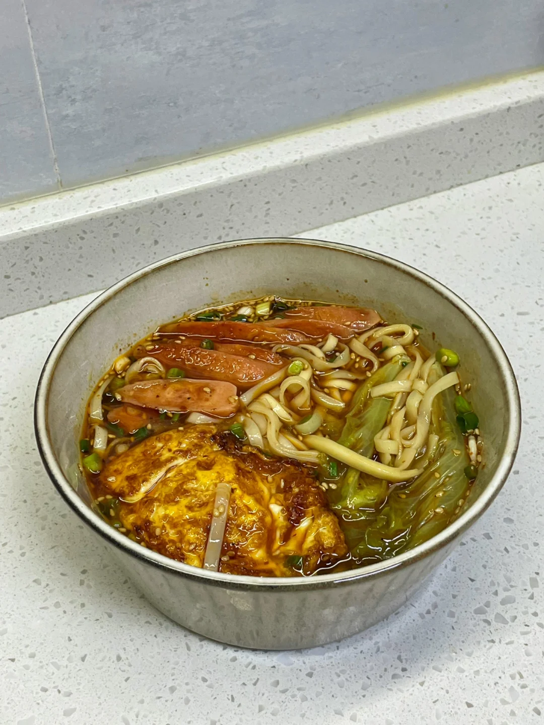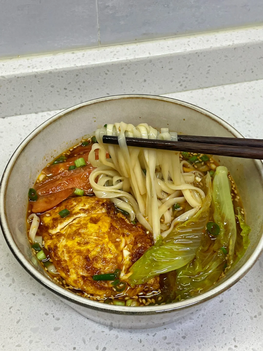 这碗酸汤面也太好吃了,汤汁都可以喝完,重点是简单快手还营养丰富哦~ 食材:面条 鸡蛋 生菜 火腿肠 配料:葱花 蒜末 白芝麻 辣椒面 猪油 生抽 胡椒粉 陈醋 蚝油 白糖 1⃣️:鸡蛋和火腿肠煎好备用,碗中加入蒜末 葱花 辣椒面 白芝麻淋热油,加两勺陈醋 三勺生抽 一勺蚝油 半勺白糖 加煮开的面汤搅匀 可以再加些虾皮 2⃣️:锅中水开加入面条和青菜煮熟放入碗中,加入煎蛋和火腿肠,撒葱花即可