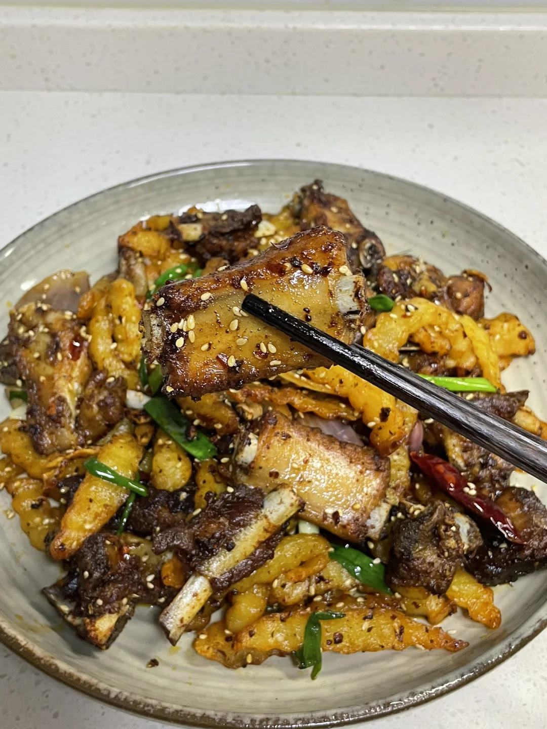 3⃣️:锅中留底油,加入姜蒜 干辣椒 干花椒炒香,再加入一大勺豆瓣酱和一小块火锅底料炒出红油,倒入排骨和土豆翻炒入味,再加入洋葱翻炒一分钟,最后加入青红椒炒匀,出锅前撒白芝麻和葱段炒匀即可