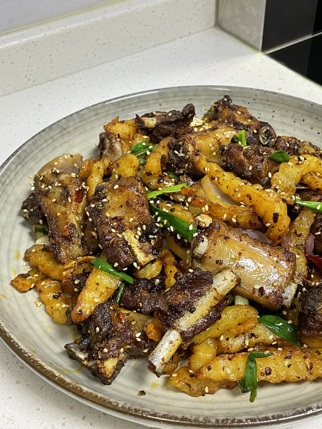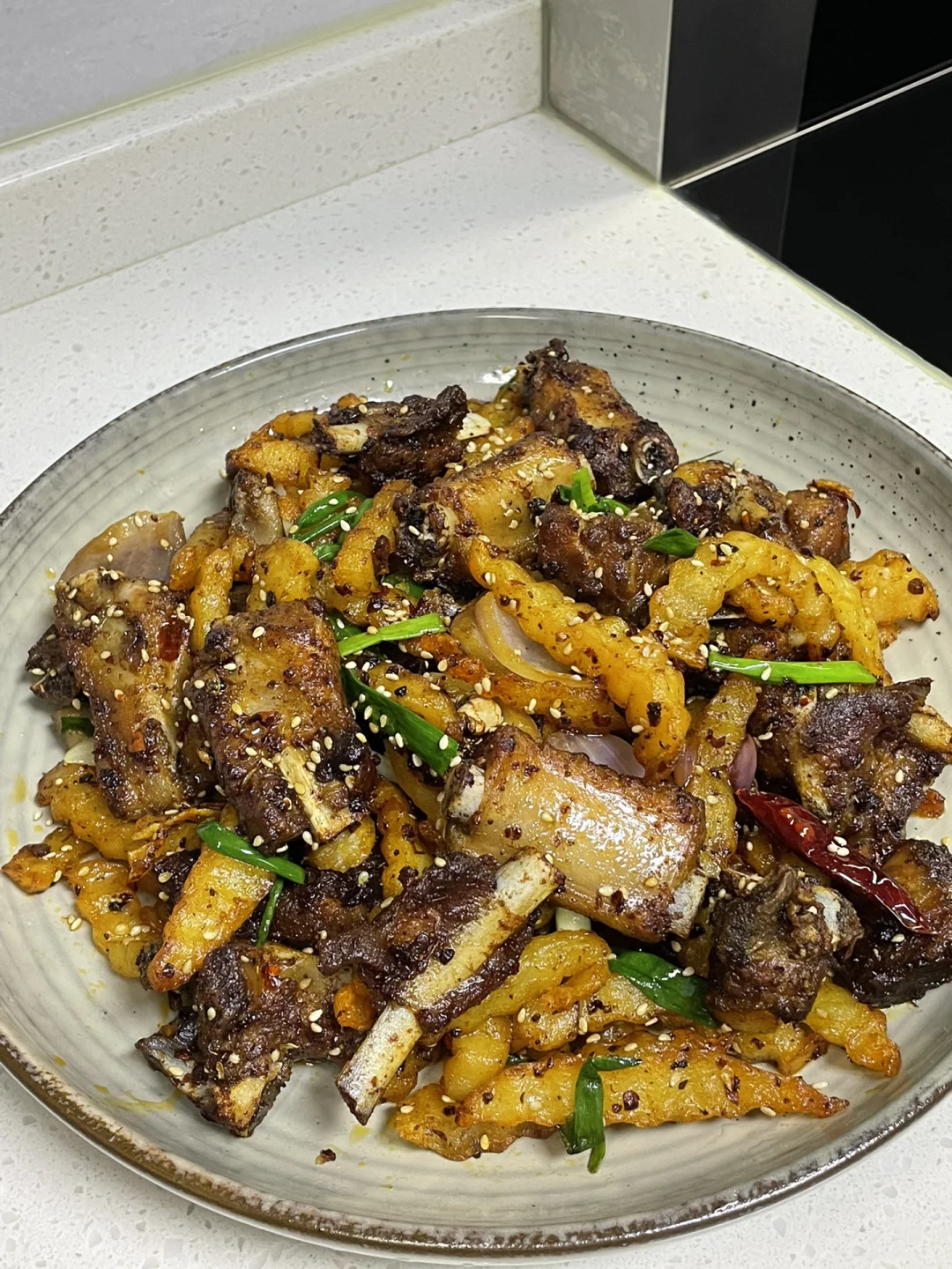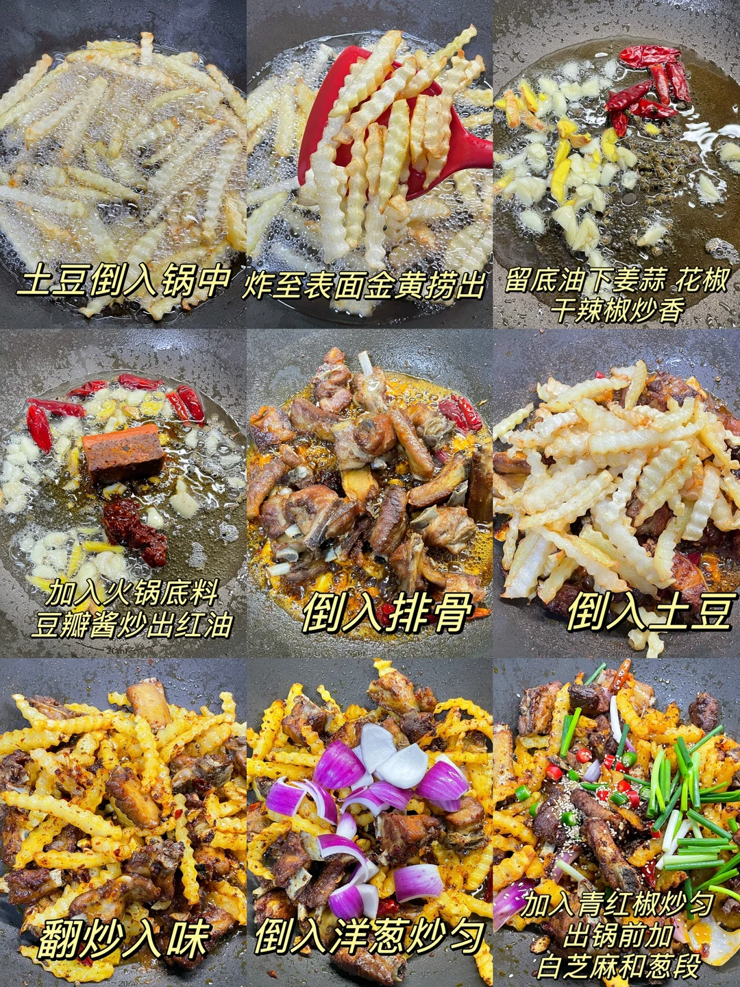 2⃣️:锅中多倒些油,油温六成热倒入排骨炸至焦黄捞出,再倒入土豆条炸至表面焦黄捞出