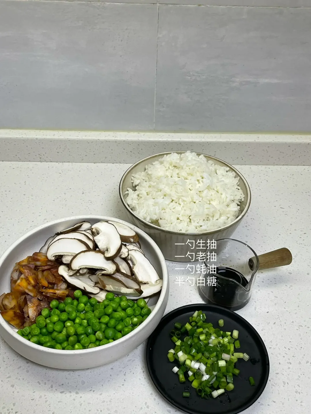 家里有剩米饭的一定要试试这个炒饭,分分钟光盘,喜欢吃炒饭的一定不要错过呀~ 食材:剩饭 香菇 腊肠 豌豆 配料:生抽 老抽 耗油 白糖 葱花 1⃣️:一勺生抽 一勺老抽 一勺蚝油 半勺白糖搅匀 2⃣️:豌豆焯水后捞出备用,香菇切薄片,腊肠切薄片,葱切碎 3⃣️:起锅倒入腊肠爆出油,倒入豌豆和香菇炒香,倒入剩饭炒散,再倒入料汁炒几分钟,翻炒入味,出锅前撒葱花即可