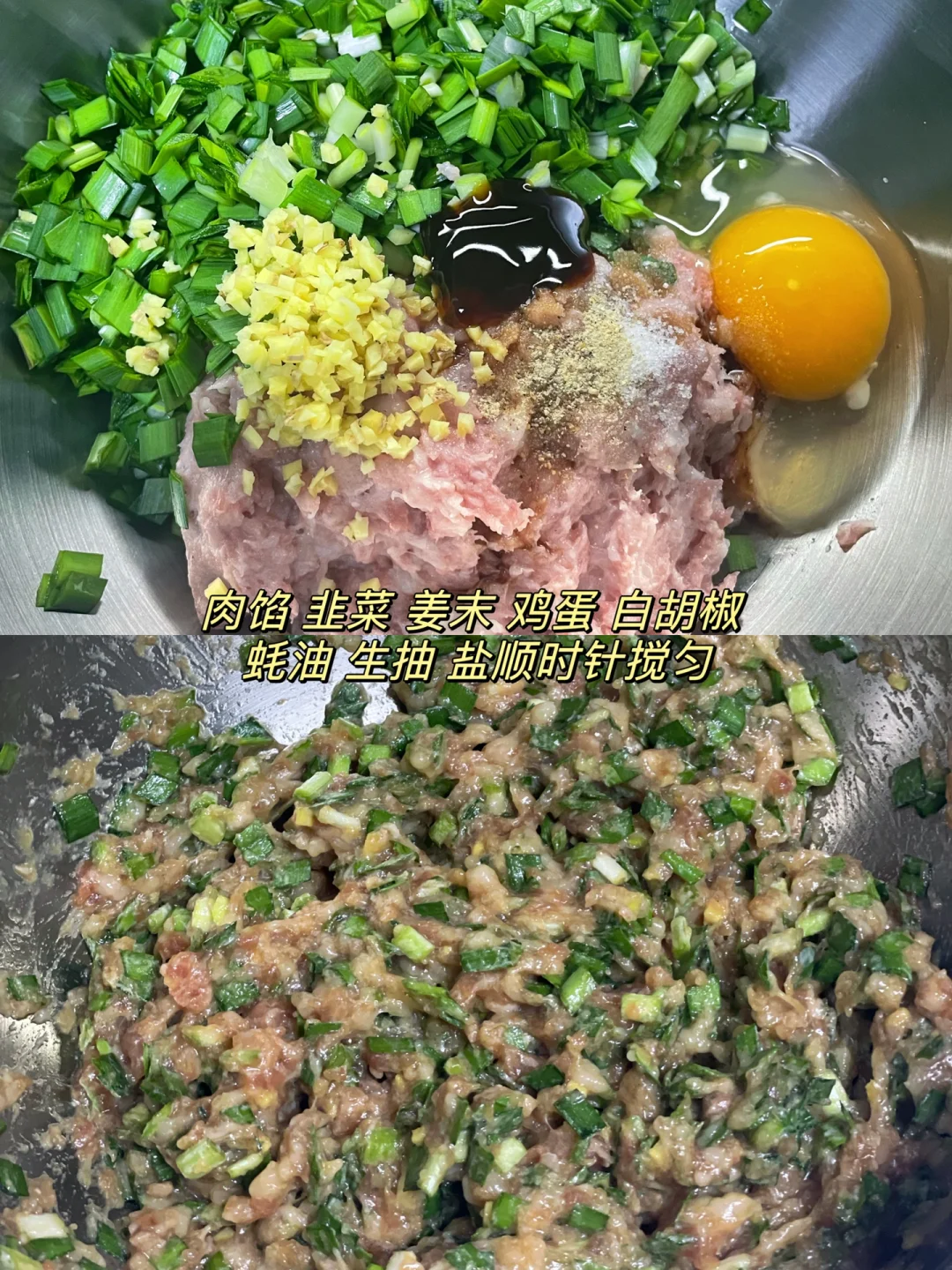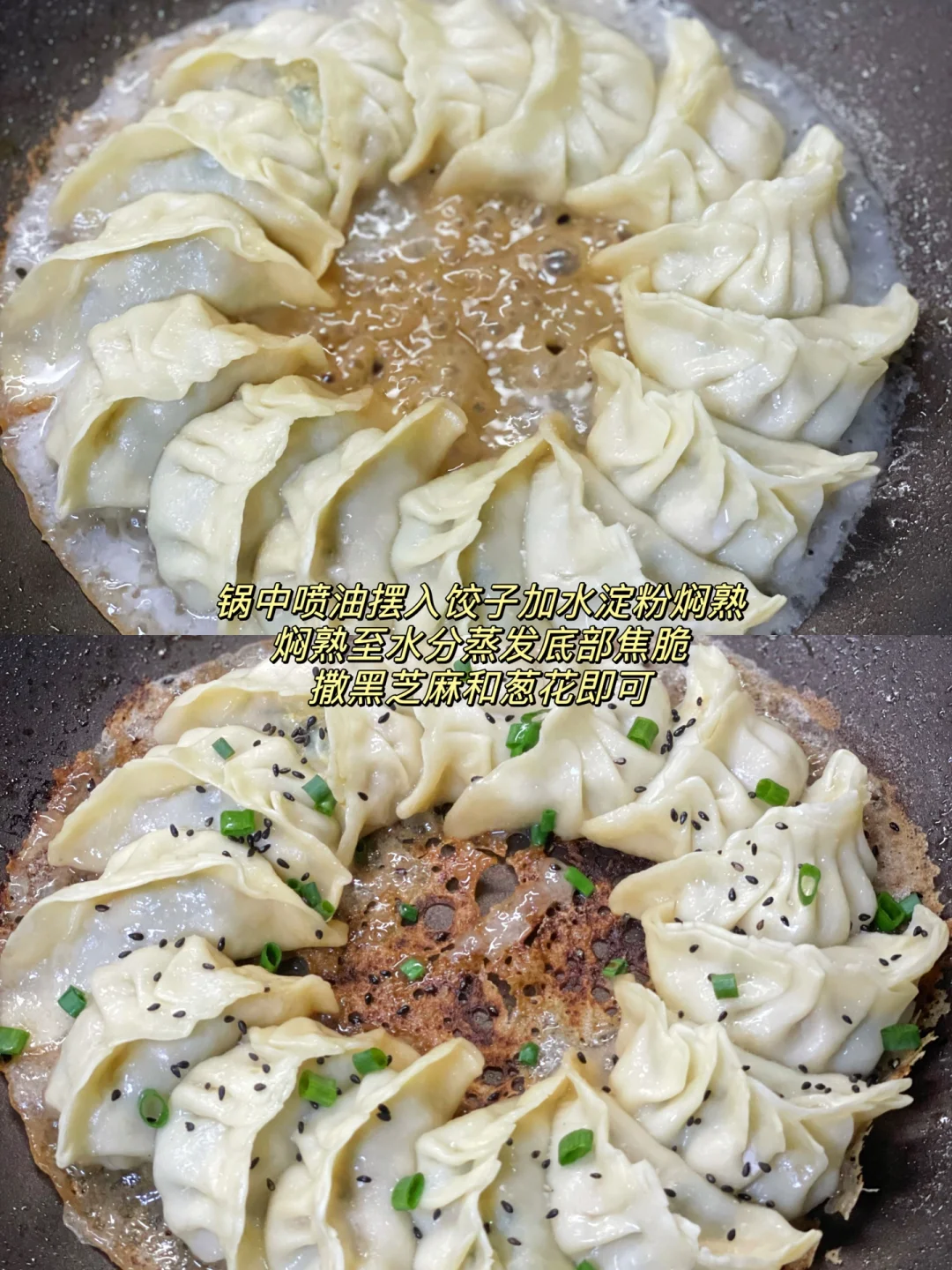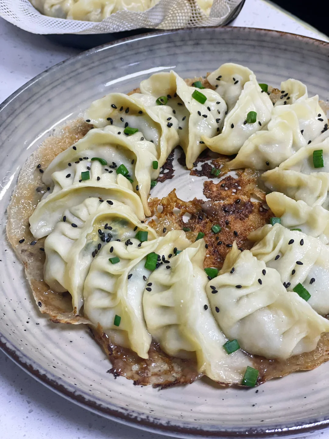 作为爱吃面食的南方娃,饺子是必备的,韭菜猪肉馅是最爱,一个人不知道吃什么的时候来点饺子最好不过了,脆底的煎饺和热气腾腾的蒸饺全都要[派对R] 食材:饺子皮 肉末 韭菜 姜末 鸡蛋 淀粉水 馅料:韭菜,姜末,肉末,鸡蛋,一勺蚝油,少许白胡椒粉,生抽,盐顺时针搅匀 蒸饺:水开上锅大火蒸20分钟 煎饺:锅中喷油,饺子摆入锅中,加入淀粉水盖上盖子焖熟,煎至底部焦脆,撒上黑芝麻和葱花即可