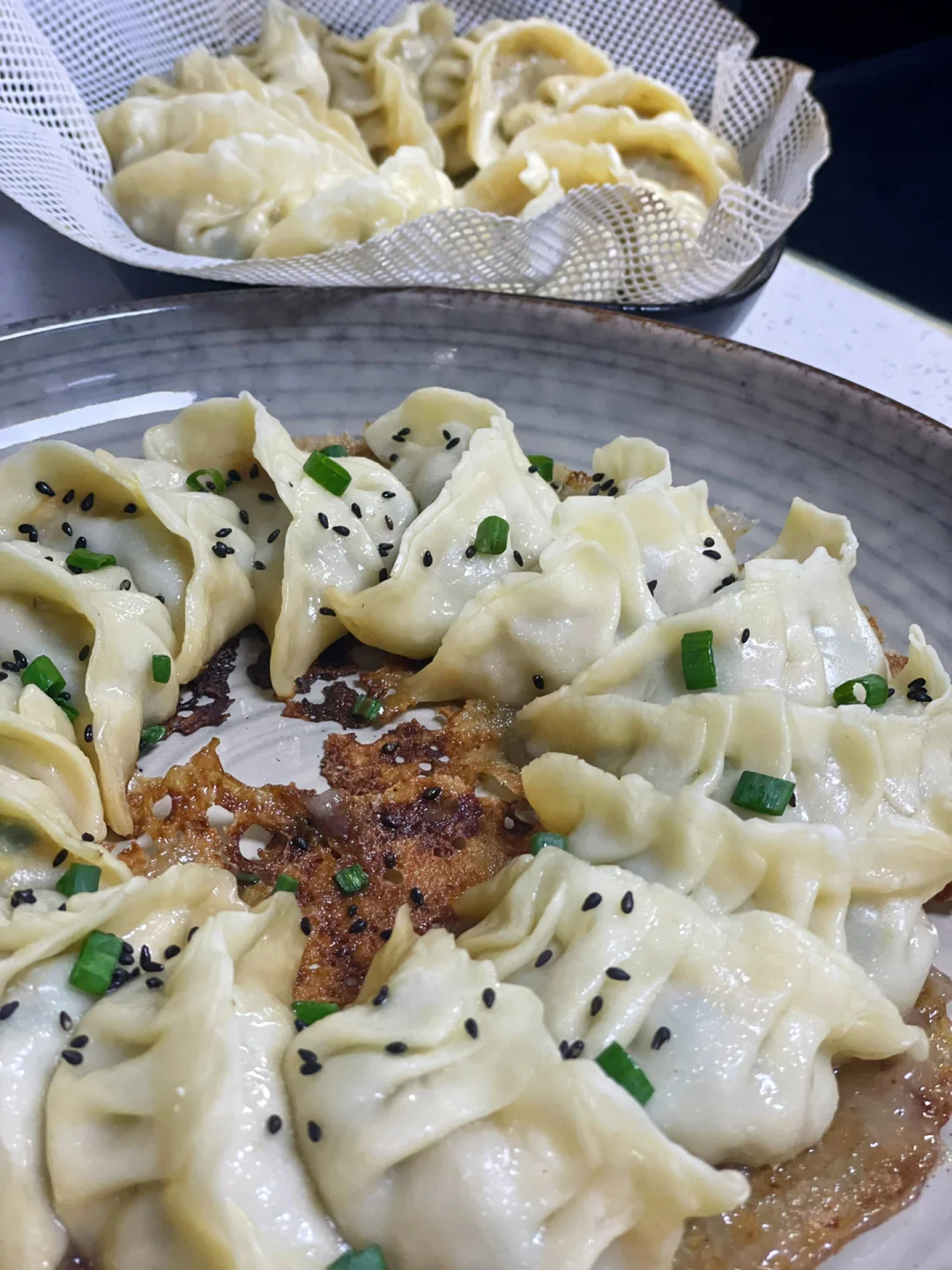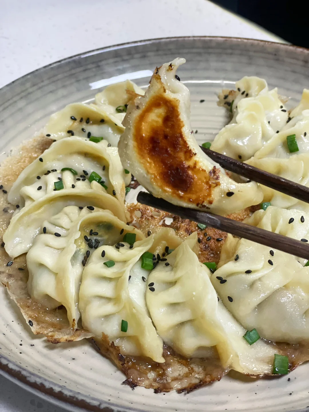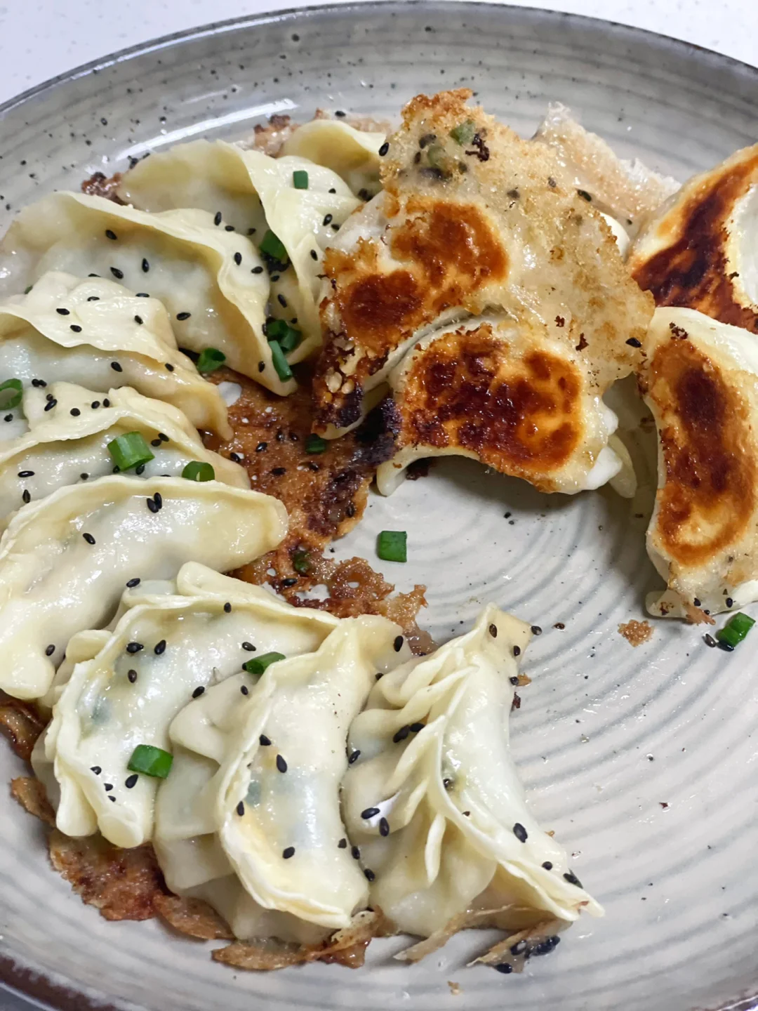 作为爱吃面食的南方娃,饺子是必备的,韭菜猪肉馅是最爱,一个人不知道吃什么的时候来点饺子最好不过了,脆底的煎饺和热气腾腾的蒸饺全都要[派对R] 食材:饺子皮 肉末 韭菜 姜末 鸡蛋 淀粉水 馅料:韭菜,姜末,肉末,鸡蛋,一勺蚝油,少许白胡椒粉,生抽,盐顺时针搅匀 蒸饺:水开上锅大火蒸20分钟 煎饺:锅中喷油,饺子摆入锅中,加入淀粉水盖上盖子焖熟,煎至底部焦脆,撒上黑芝麻和葱花即可