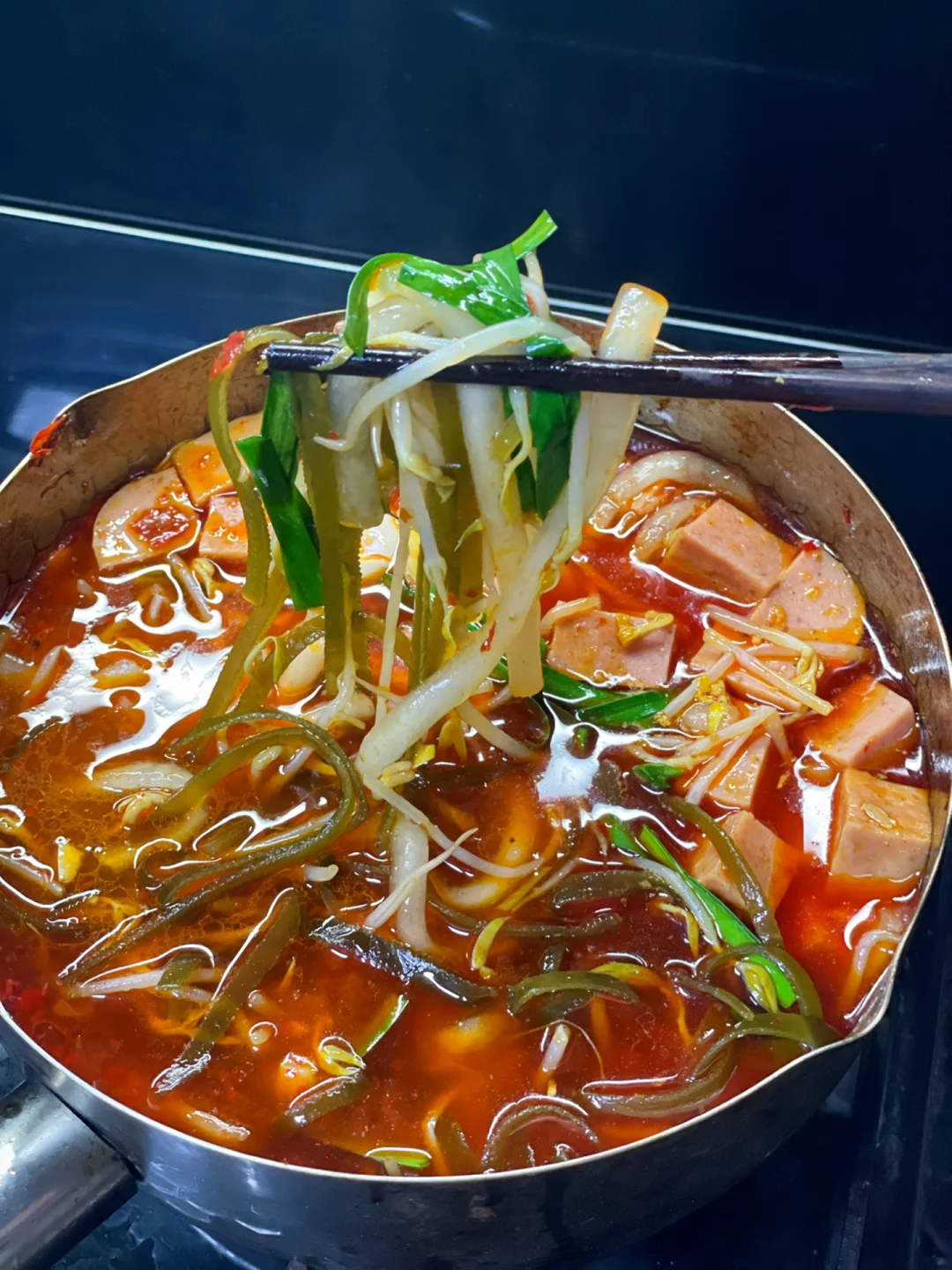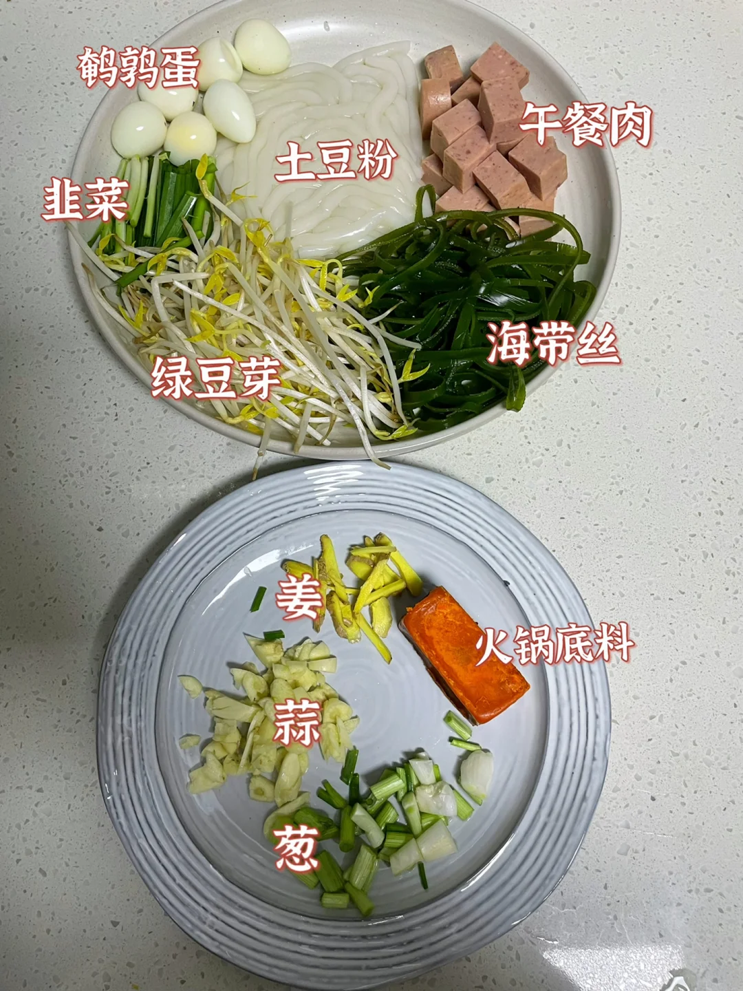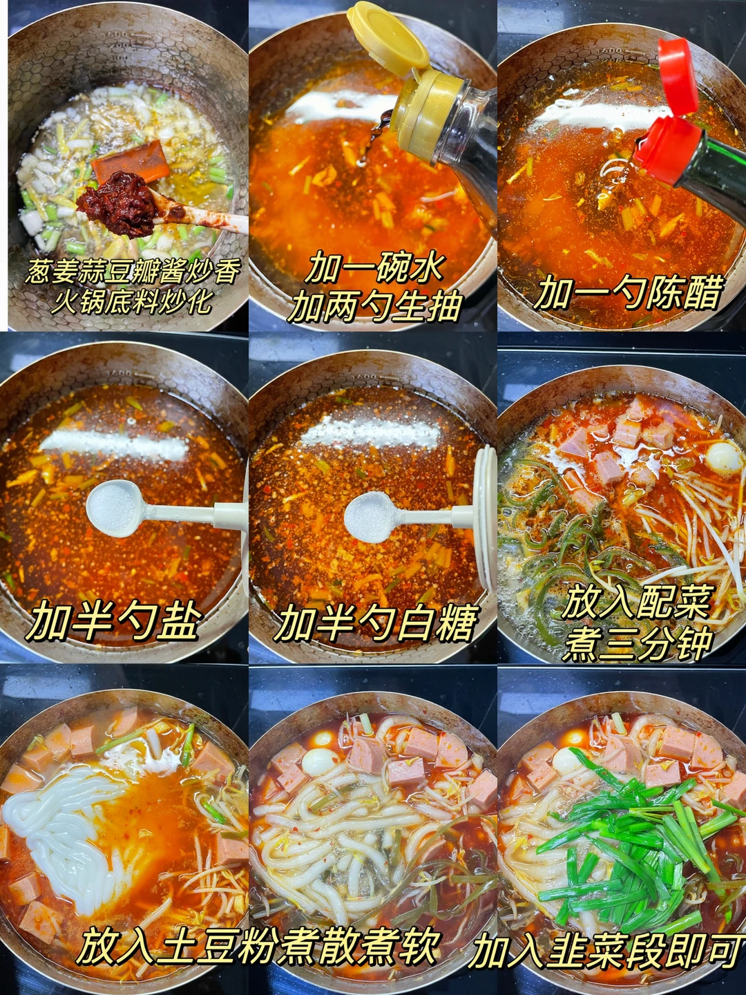 最近又降温了,来一份麻辣的火锅土豆粉也太过瘾了,十分钟就能搞定 食材:土豆粉,午餐肉,豆芽,海带丝,韭菜 1⃣️:油热放入葱姜蒜炒香钱,加一勺豆瓣酱炒匀,放入火锅底料炒化,加一碗水煮开,加两勺生抽一勺陈醋,半勺盐和白糖调味 2⃣️:水开后放入配菜煮3分钟,再放入土豆粉煮软,加入韭菜段即可