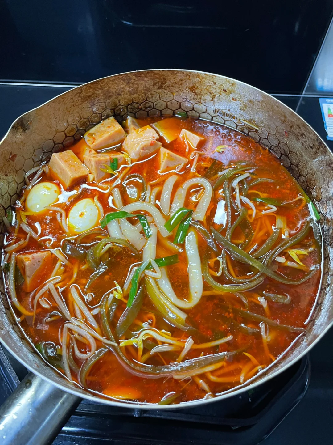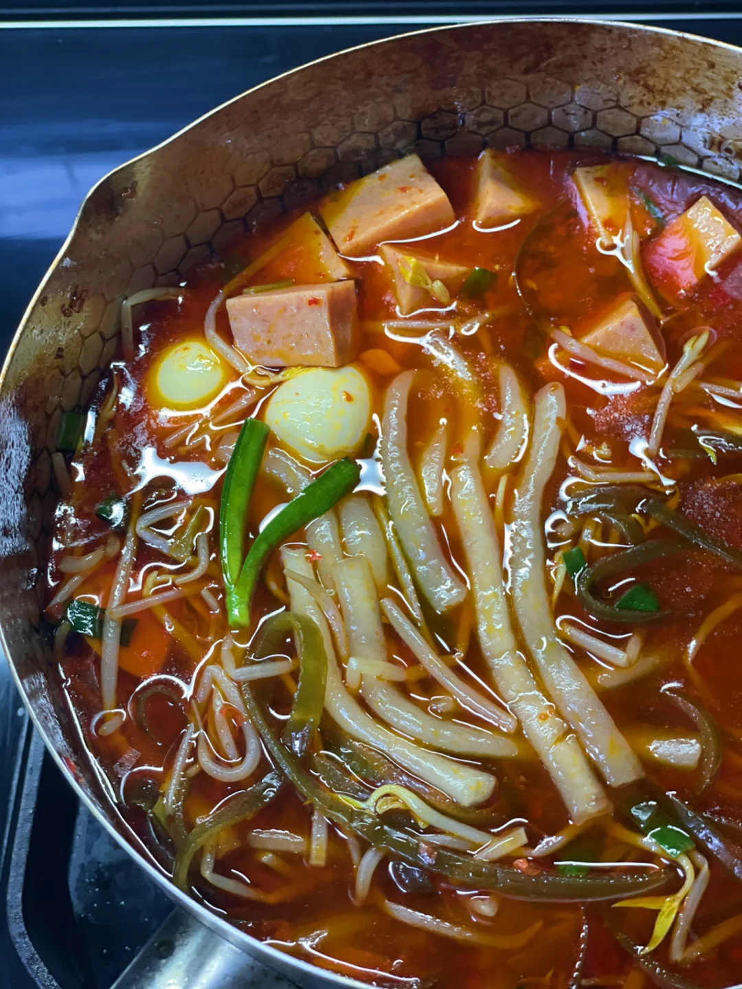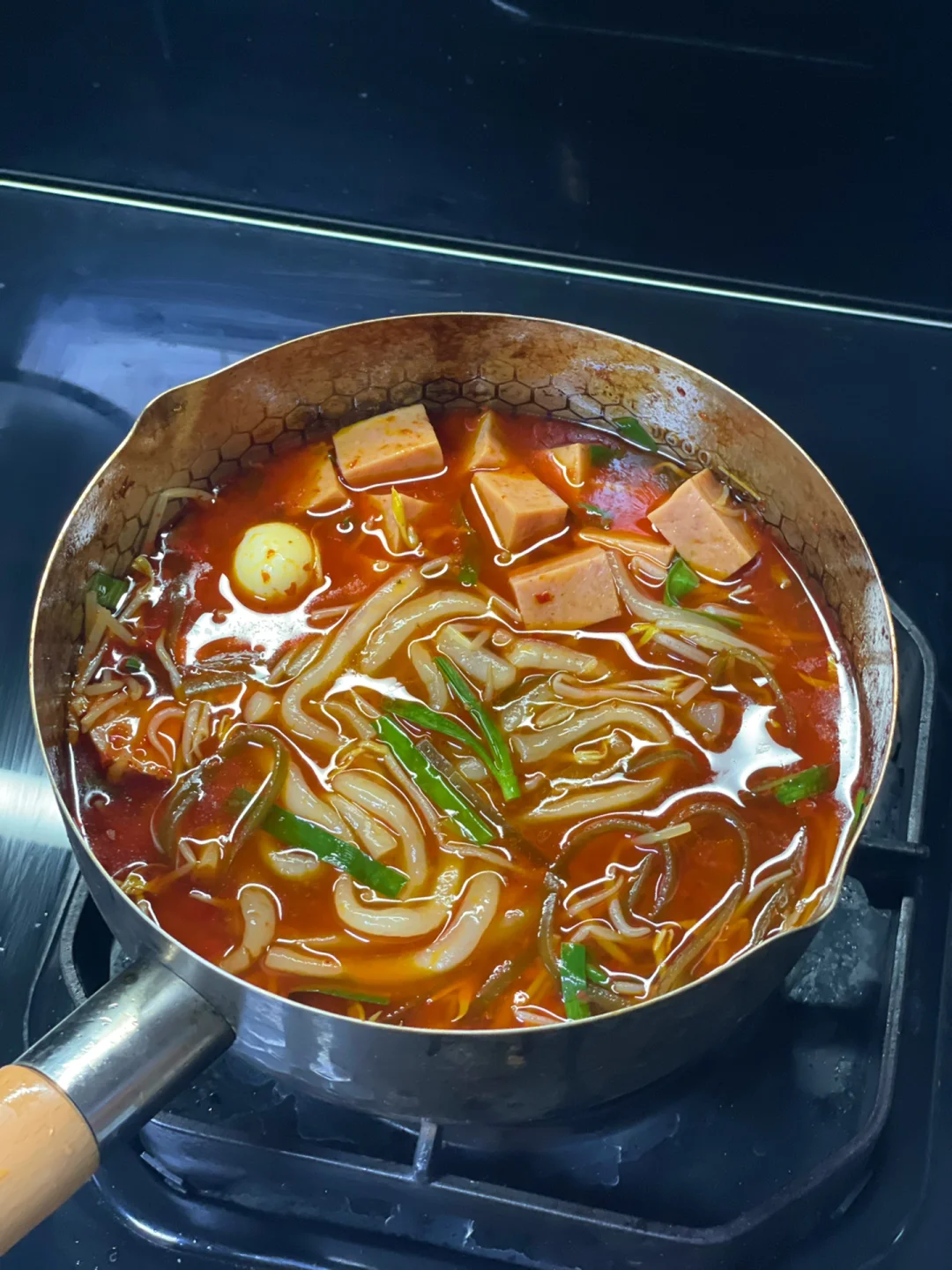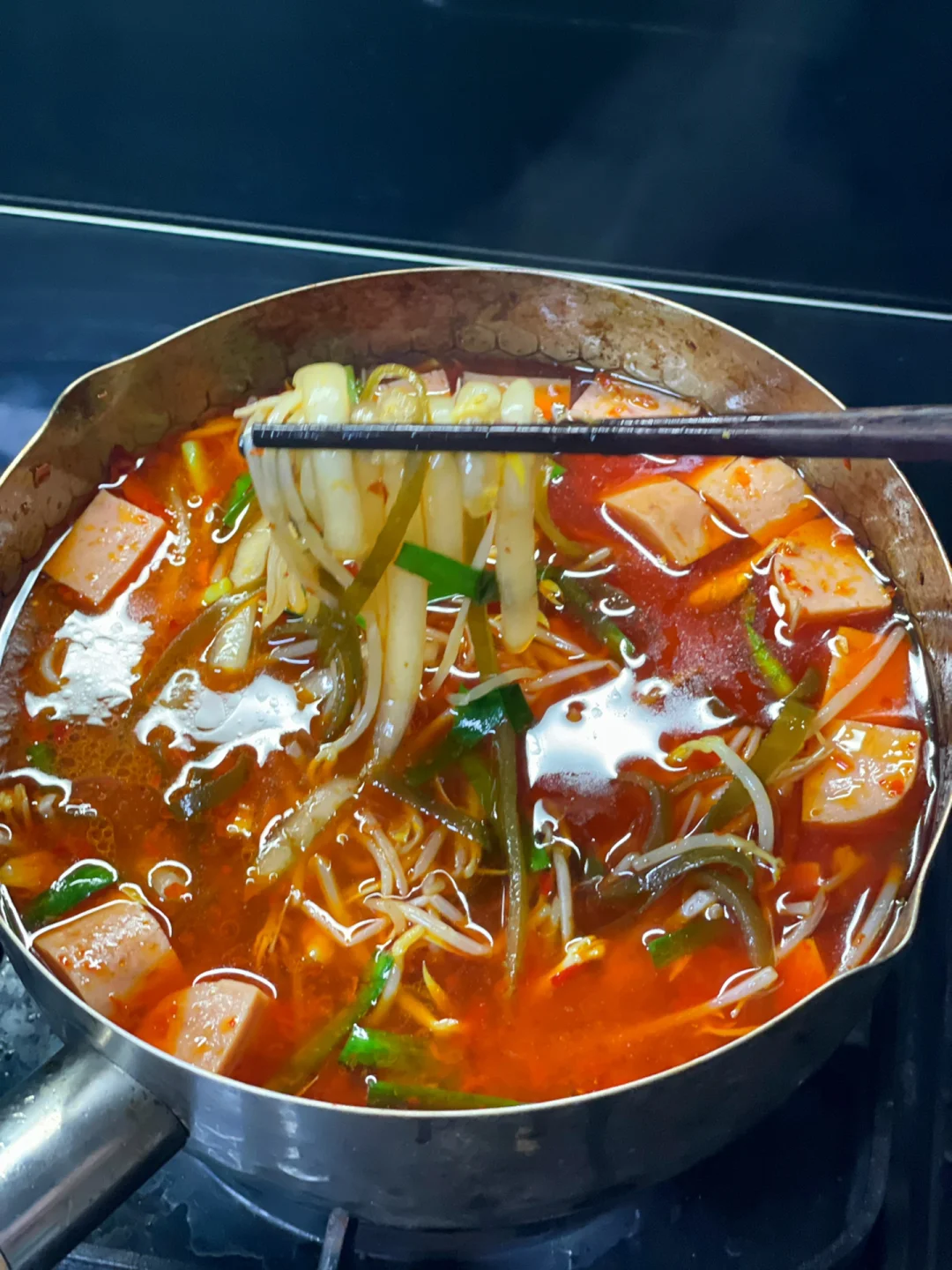 最近又降温了,来一份麻辣的火锅土豆粉也太过瘾了,十分钟就能搞定 食材:土豆粉,午餐肉,豆芽,海带丝,韭菜 1⃣️:油热放入葱姜蒜炒香钱,加一勺豆瓣酱炒匀,放入火锅底料炒化,加一碗水煮开,加两勺生抽一勺陈醋,半勺盐和白糖调味 2⃣️:水开后放入配菜煮3分钟,再放入土豆粉煮软,加入韭菜段即可