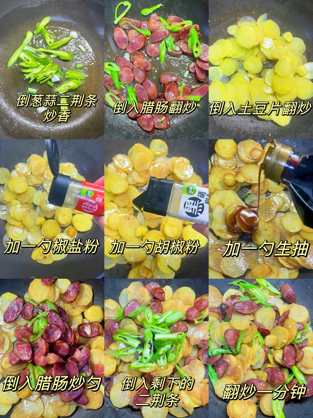 又到了吃腊肠的时候了,吃腻了蒸的腊肠,炒来吃也很不错哦,别样风味,依旧是下饭神器[偷笑R][偷笑R] 🍀🍀🍀食材:小土豆5个,腊肠2根,2根二荆条葱,蒜 1⃣️:土豆切薄片焯水后沥干水分,加一勺盐抓匀,腊肠切片,二荆条切片 2⃣️:油热倒入葱蒜二荆条炒香,再倒入腊肠爆炒二分钟捞出备用,倒入土豆片炒匀,加一勺生抽,一勺椒盐粉,一勺胡椒粉炒匀,再倒入腊肠炒匀,加入二荆条翻炒一分钟即可