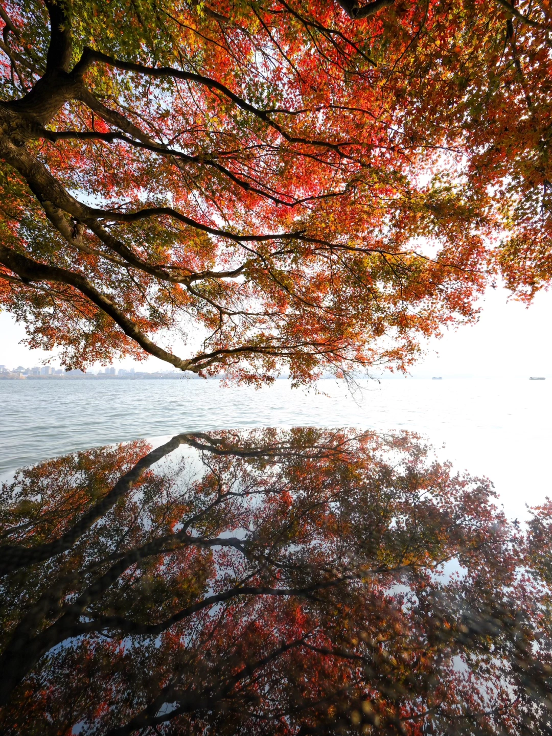 · 就在湖边的一个亭子,是拍红枫的绝佳取景框!🍁一定要在上午10点后去,阳光穿过红色的枫叶,叶子会发光,层次感绝了!以古亭和西湖为背景,怎么拍都震撼。
