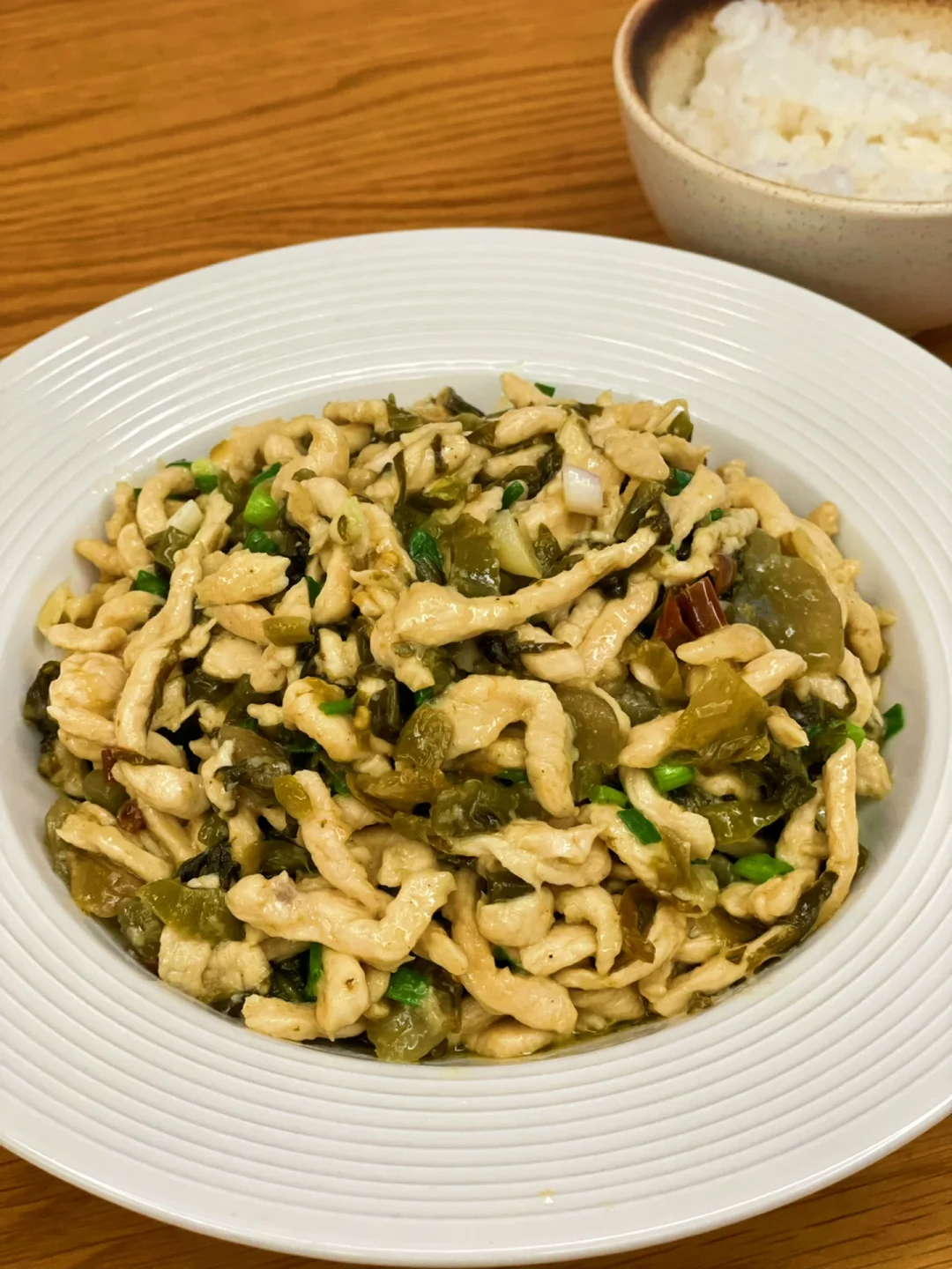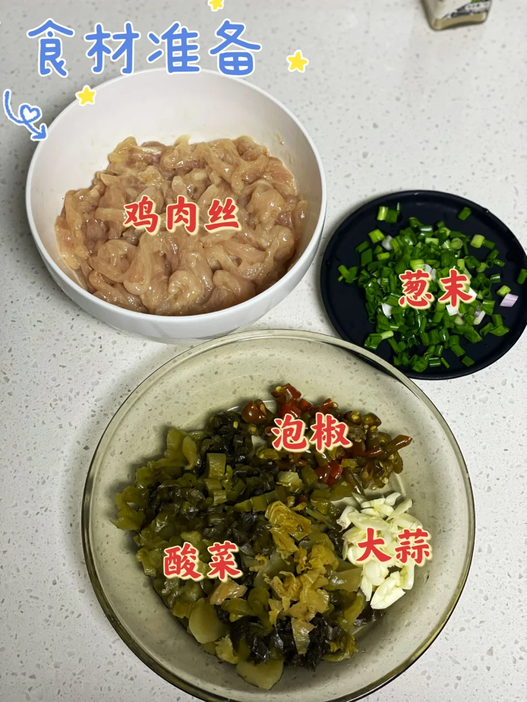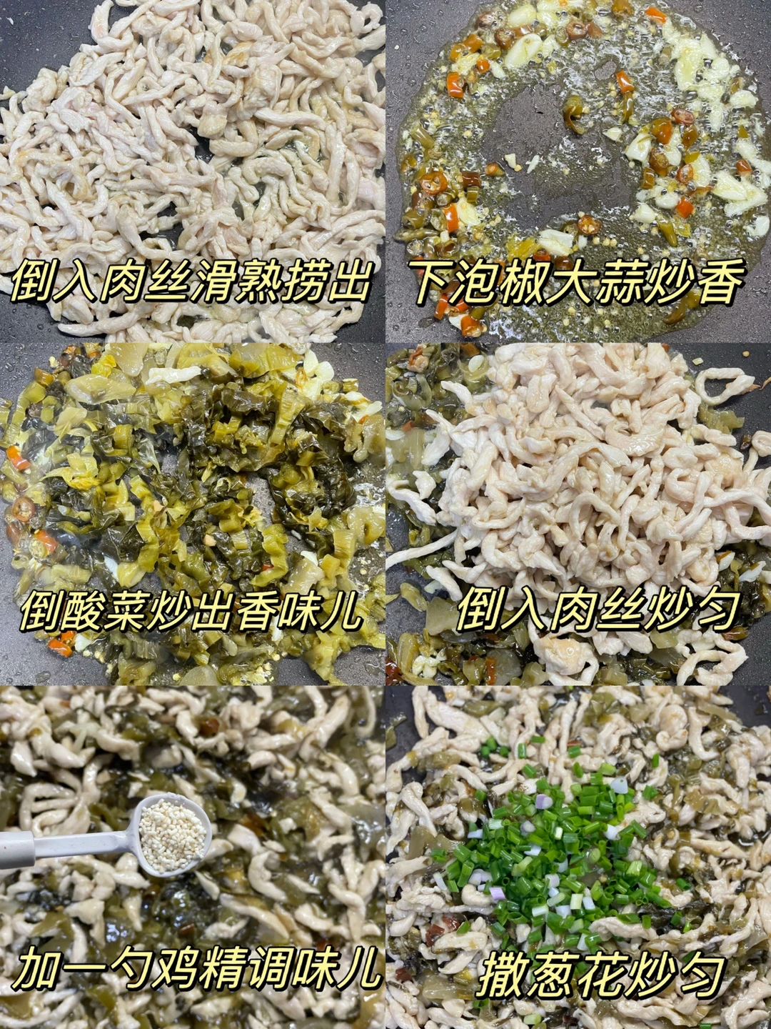 万物皆可配,酸菜可以炖,可以炒,可以煮,这样炒出来的酸菜肉丝,肉不柴,酸菜开胃,巨下饭,要是家里有面,高低拌两碗过过瘾😋 🥗食材:鸡胸肉,酸菜,大蒜,葱 1⃣️:鸡胸肉洗净切丝,加入三勺淀粉,一勺生抽,一勺胡椒粉抓匀腌制十分钟,酸菜大蒜切碎,葱切碎 2⃣️:油热下肉丝滑熟捞出,留底油,倒入泡椒和大蒜炒香,再倒入酸菜翻炒2分钟,充分炒出酸菜的香味儿再倒入肉丝炒匀,加一勺鸡精调味儿,最后撒上葱花炒匀出锅