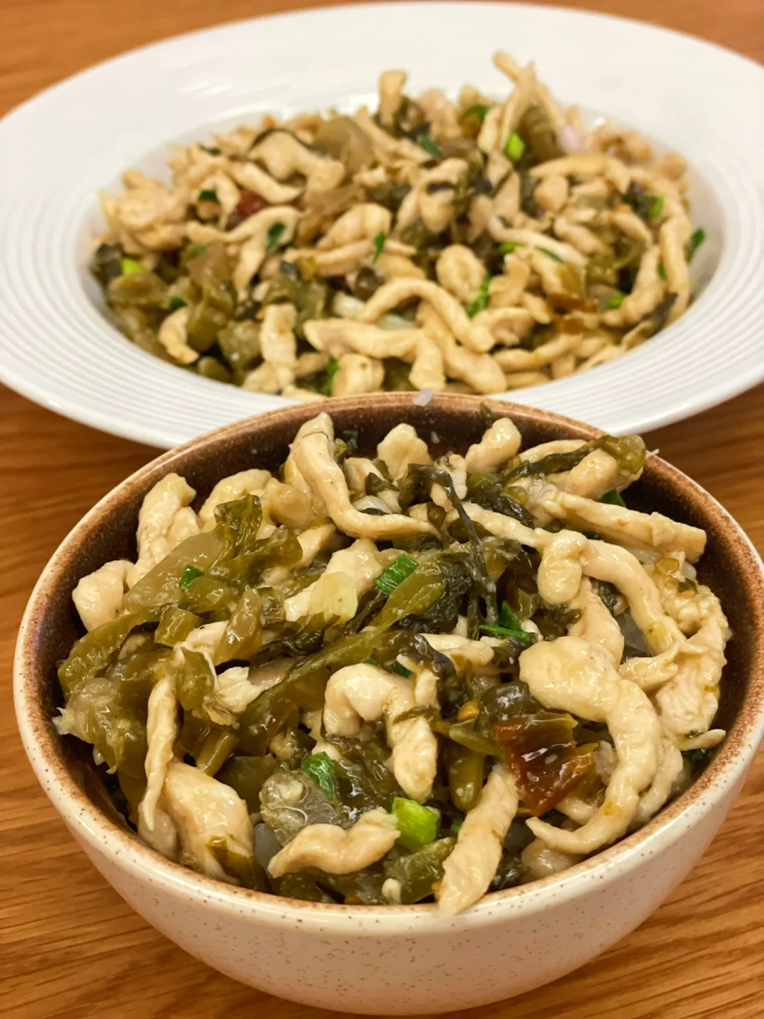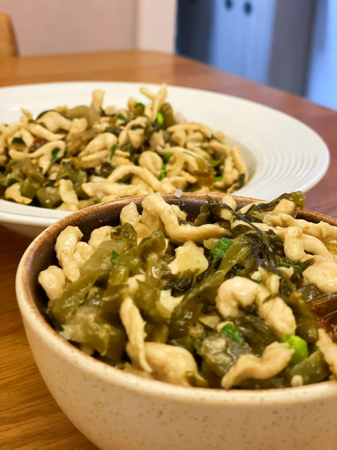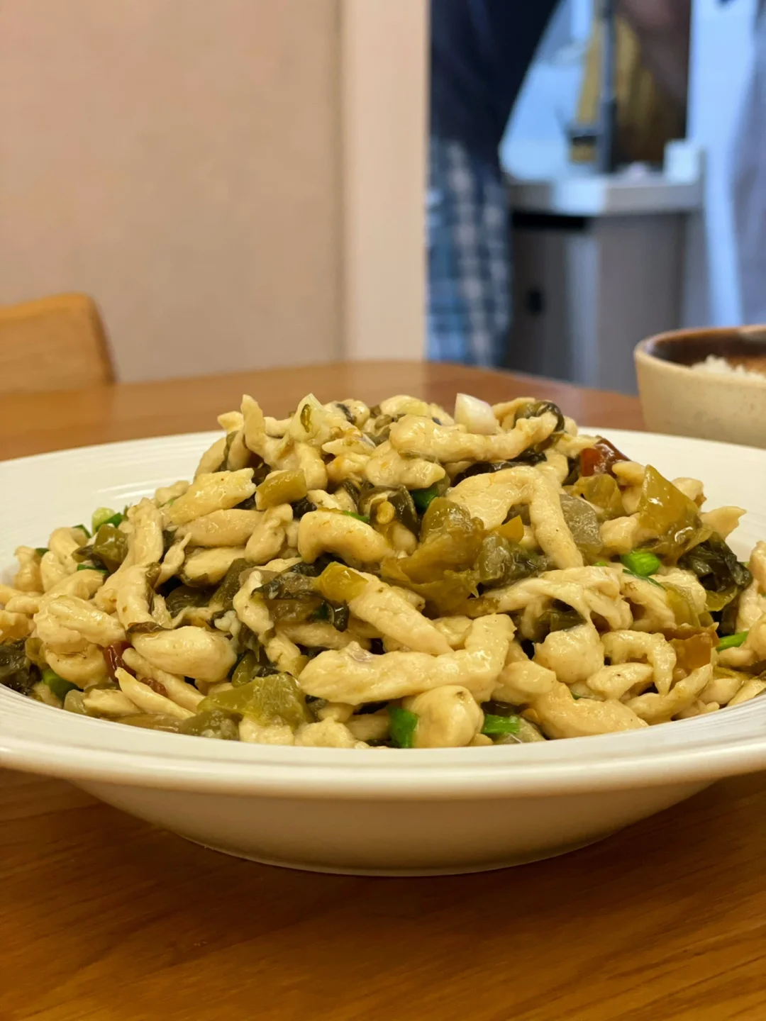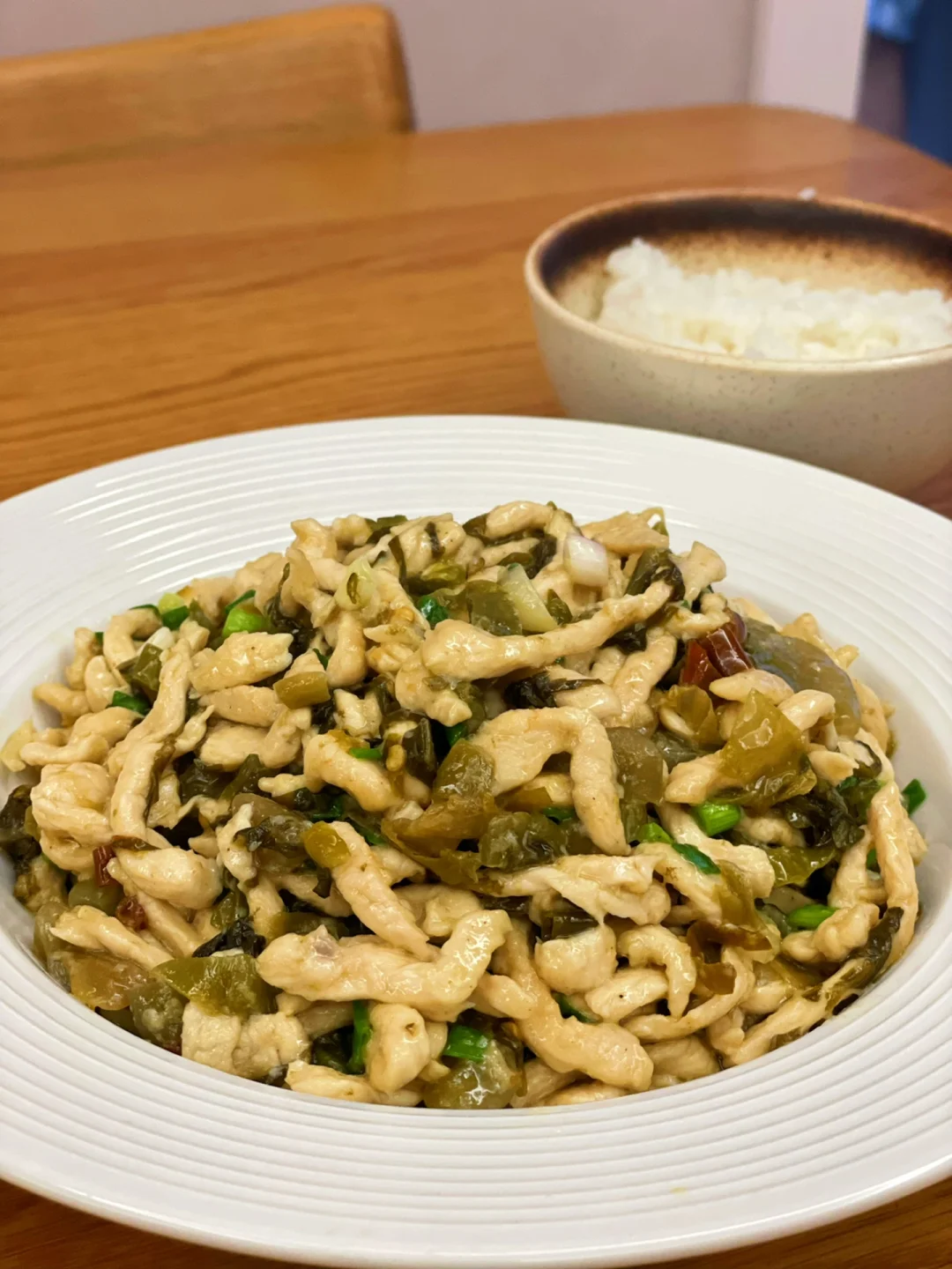万物皆可配,酸菜可以炖,可以炒,可以煮,这样炒出来的酸菜肉丝,肉不柴,酸菜开胃,巨下饭,要是家里有面,高低拌两碗过过瘾😋 🥗食材:鸡胸肉,酸菜,大蒜,葱 1⃣️:鸡胸肉洗净切丝,加入三勺淀粉,一勺生抽,一勺胡椒粉抓匀腌制十分钟,酸菜大蒜切碎,葱切碎 2⃣️:油热下肉丝滑熟捞出,留底油,倒入泡椒和大蒜炒香,再倒入酸菜翻炒2分钟,充分炒出酸菜的香味儿再倒入肉丝炒匀,加一勺鸡精调味儿,最后撒上葱花炒匀出锅