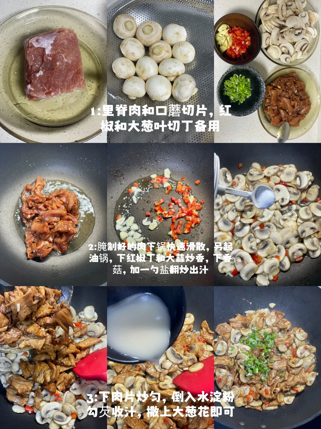 口蘑炒肉这道菜也太鲜了吧,清脆爽口,好吃又下饭😻关键是几分钟就可以搞定的家常菜,赶紧get起来~ 🥗食材:里脊肉一小块,口蘑,红椒一小块,少许大葱叶,大蒜 👩🍳做法简单 1⃣️:将肉和口蘑分别改刀切片,红椒和大葱叶切丁,切好的肉里加入一勺盐,一勺生抽,一勺老抽,少许胡椒粉,半勺蚝油,两勺淀粉抓匀,最后加入少许食用油锁水 2⃣️:油热下入腌制好的肉片快速滑散捞出备用,另起油锅下红椒丁和大蒜炒香后倒入口蘑,加一勺盐炒出汁水 3⃣️:倒入肉片翻炒,再加入水淀粉勾芡收汁,最后撒上大葱花增香点缀即可