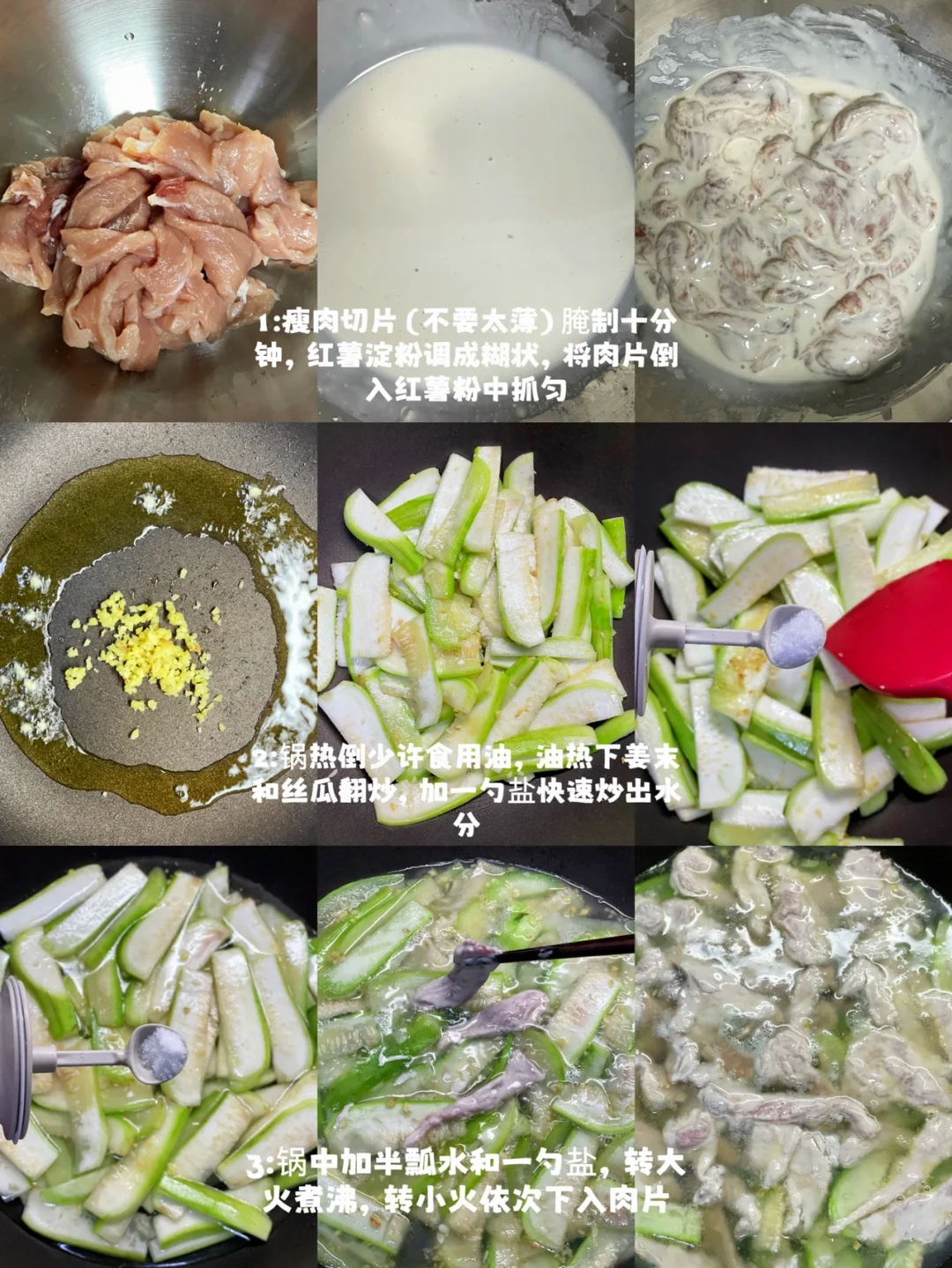记忆中的年夜饭上一定少不了这样一碗滑肉汤,上次吃滑肉汤还是过年时妈妈做的,汤鲜味美,肉片嫩滑,一刻也不能忘记🥰 🧾食材:瘦肉,丝瓜,红薯淀粉 👩‍🍳做法简单 1⃣️:丝瓜切片,瘦肉切厚度适中的片,加一勺盐,半勺生抽,少许姜粉,少许胡椒粉抓匀腌制十分钟,抓到粘手的状态最好 2⃣️:红薯淀粉里少量多次加入温水抓匀(用温水不容易脱浆,也容易抓匀,粉浆稍微干一点点),再将腌好的肉片倒入粉浆中抓匀,必须要使每一片肉都裹上厚厚的粉浆 3⃣️:起锅烧油,油热下姜末、丝瓜,加一勺盐快速炒出水分,再加入半瓢水和一勺盐调味,关盖转大火煮沸 4⃣️:小火下滑肉(一片一片的依次下入,下肉片的动作要轻,并且不能搅拌),肉片下完后转中小火煮至定型,加入少许猪油和一勺鸡精,搅匀后出锅,撒小葱花即可 温馨提示:一定要用红薯粉淀粉‼️