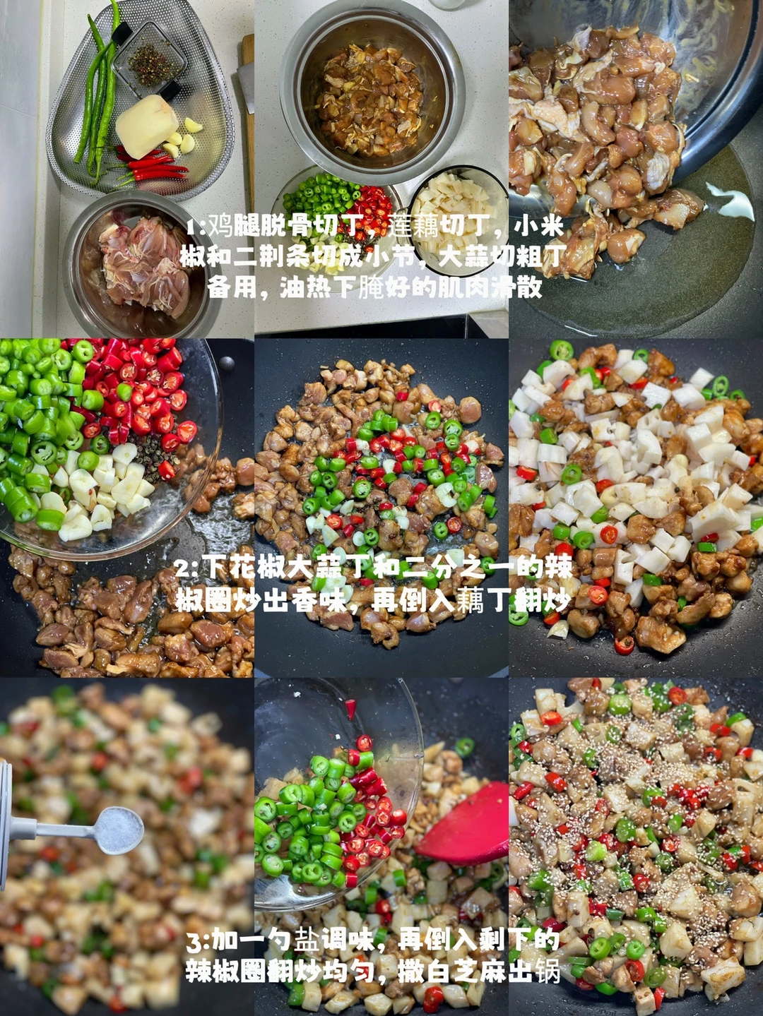 无辣不欢🤷双椒鸡丁🉑️,有一说一,辣是真的辣,好吃也是真的好吃,太下饭了,毫不夸张,连辣椒都是香的🌶 🧾食材:鸡腿,莲藕,红小米辣,二荆条,花椒,大蒜 👩🍳做法简单 1⃣️:鸡腿脱骨切丁,大蒜莲藕切丁,辣椒切小圈备用 2⃣️:鸡腿中加入一勺生抽,一勺老抽,一勺蚝油,一勺鸡精,一勺胡椒粉,两勺淀粉抓匀,再加入一勺花椒油 3⃣️:锅中烧油,转大火下腌好的鸡丁,快速翻炒,再下入花椒大蒜和二分之一辣椒炒香,再倒入藕丁翻炒2分钟,加入一勺盐调味儿,最后倒入剩下的辣椒炒匀,撒白芝麻即可