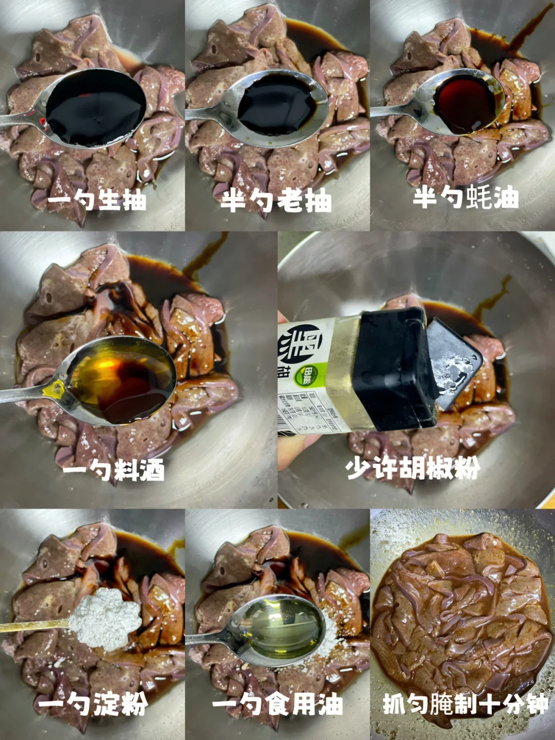 1⃣️:猪肝切薄片放清水中洗出血水(一定要多洗几遍)洗净的猪肝挤干水分,加入调料抓匀腌制十分钟
