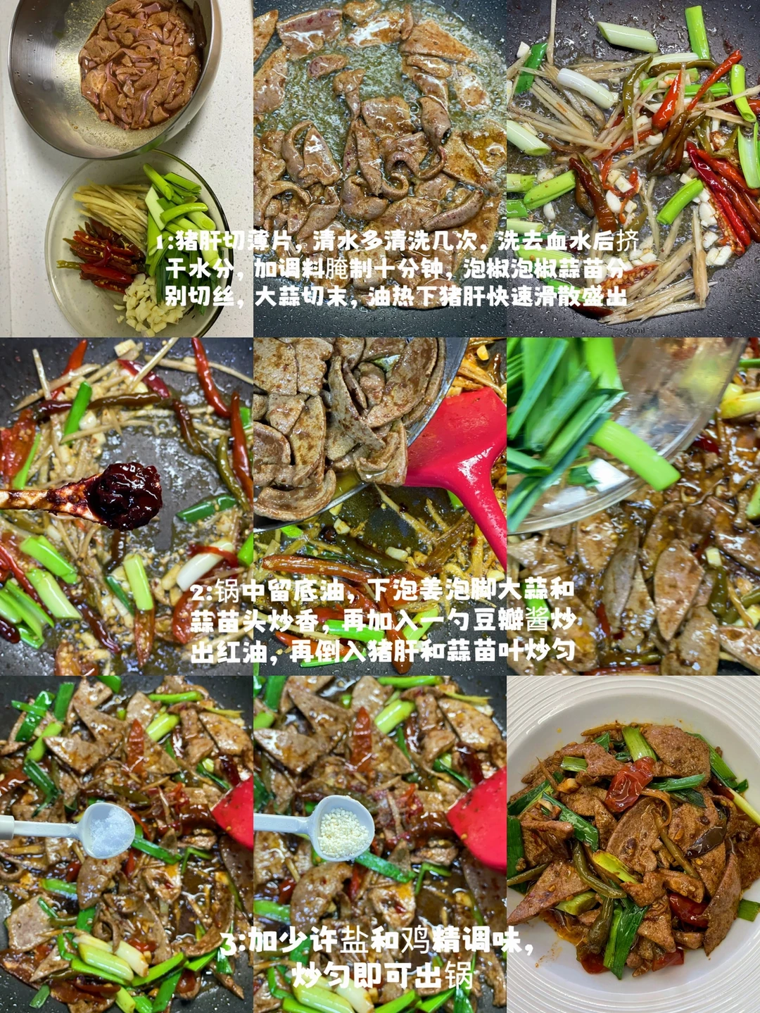 3⃣️:油热下猪肝快速滑散盛出,锅中留底油下泡椒泡姜大蒜和蒜苗头炒香,加一勺豆瓣酱炒出红油,再倒入猪肝和蒜苗叶炒炒匀,加半勺盐和半勺鸡精调味即可出锅