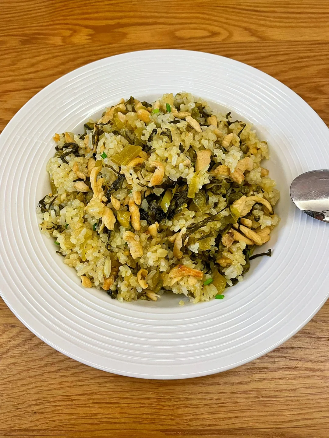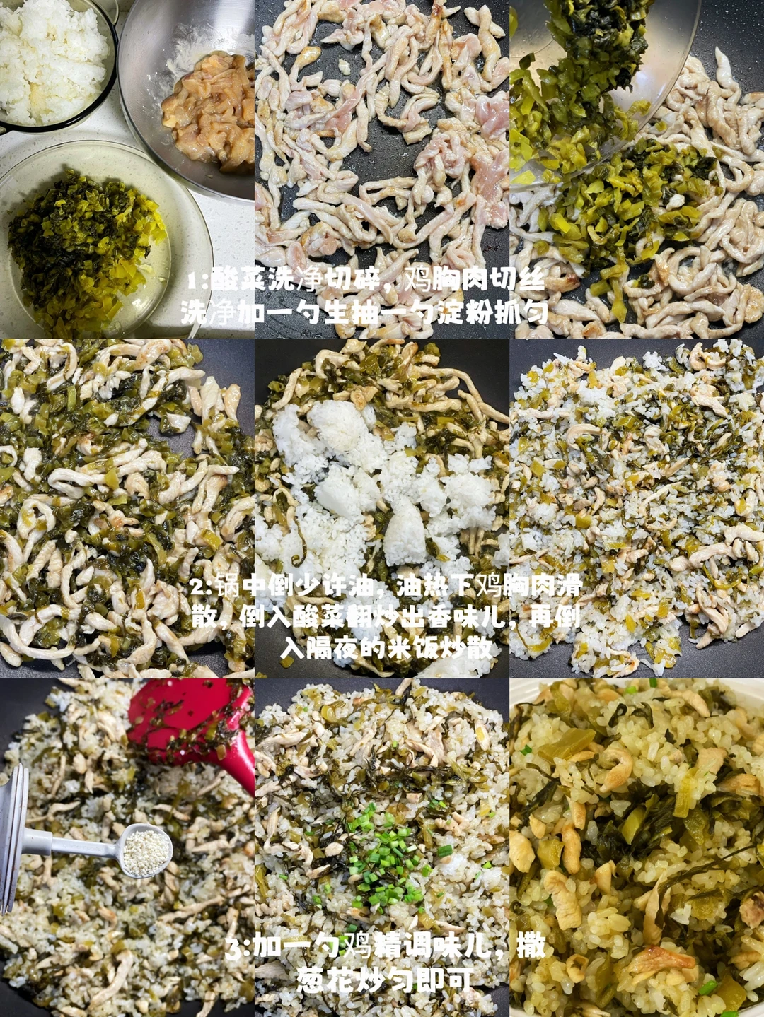 爱吃炒饭,爱吃酸菜🤤 刚逛街回来,对象说肚子饿了,突然想吃酸菜肉丝炒饭,那么自己动手吧,分分钟搞定,这是今夜的快乐源泉之一[偷笑R][偷笑R] 🧾食材:鸡胸肉,酸菜,隔夜饭 1⃣️:鸡胸肉洗净切丝,加入一勺生抽,一勺淀粉抓匀,酸菜切碎备用 2⃣️:锅中加少许油,油热倒入鸡胸肉快速滑散,倒入酸菜炒出香味,再把隔夜的米饭倒入锅里炒至粒粒分明 3⃣️:加入一勺鸡精调味儿,撒葱花炒匀即可(酸菜自带咸味儿,就不用单独加盐了) 干饭人一口气吃掉一大盘🍚🍚🍚