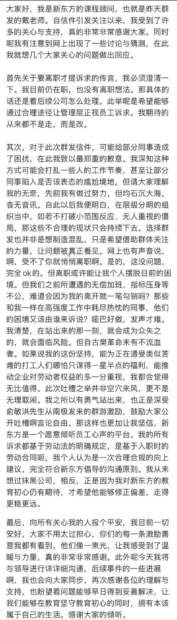 新东方控诉加班当事人最新发声,选择群发只是希望借助群体关注的力量,让问题被真正看见。 据了解,该员工为新东方的课程顾问,今年24岁。 有网友评论:情怀分和滤镜加多了容易误导年轻人踏错行业。 做过销售的都知道,加班外出是常态,毕竟谁也不想错过一个潜在客户。 我之前也做过机构的课程顾问,就是寻找潜在客户(卖课),发传单、与客户沟通、协调上课时间……