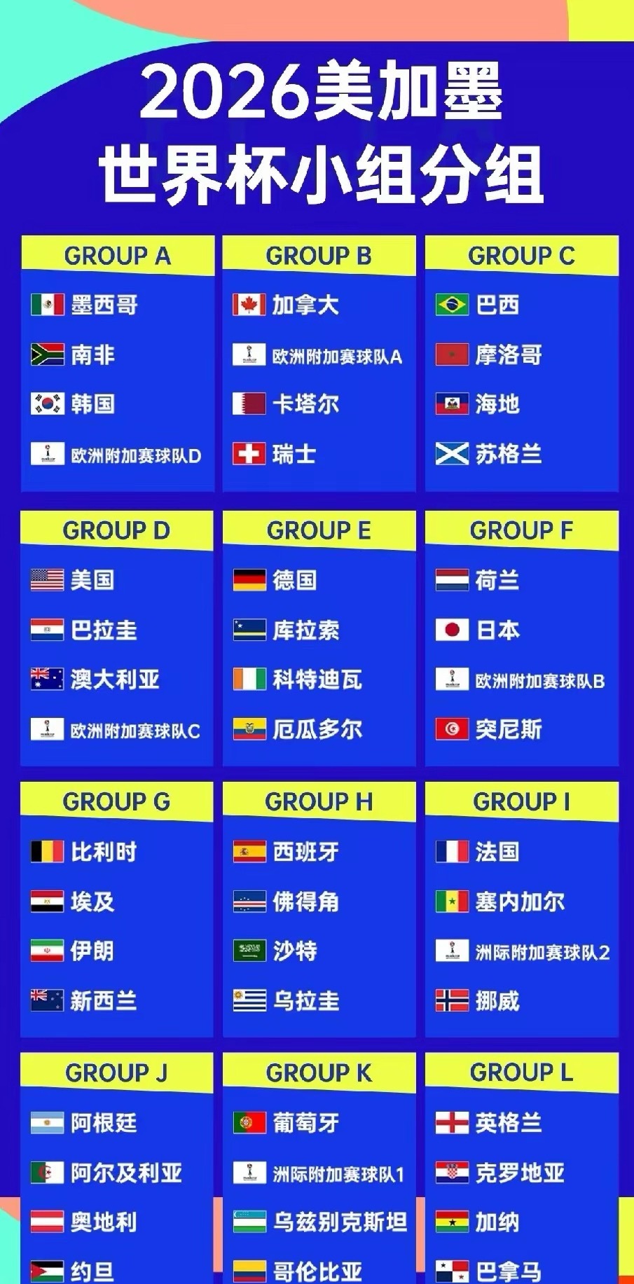 世界杯分组:一眼看过去,全是好签因为8个成绩最好的小组第3也将晋级32强,所以,本次世界杯分组,大家都会挺满意。3个东道主肯定满意的,主场作战,他们本来实力也不弱,一胜一平,压力不大。巴西、阿根廷、德国、比利时、西班牙、葡萄牙、英格兰,都没什么不满意的,出线压力不大。唯一称得上死亡之组的,是法国队与非洲最强队塞内加尔和第三档最强队挪威队以及可能的玻利维亚队,要绞杀一番了。这也是小组赛唯一的看点:姆巴佩直接VS哈兰德。