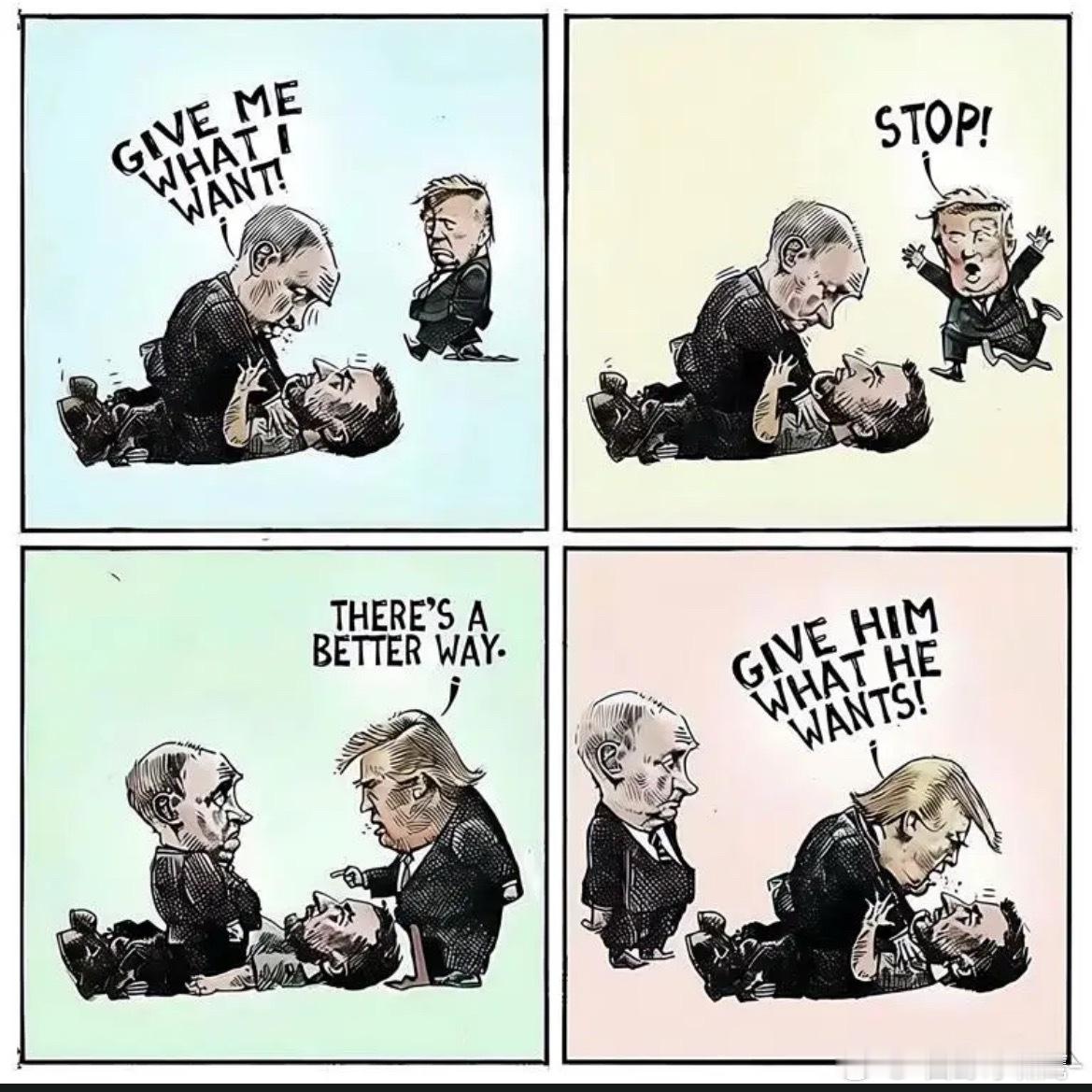 俄乌漫画1、普京:把我想要的都给我!2、特朗普:停一下!3、特朗普:我有个更好的办法。4、特朗普:把他想要的都给他!
