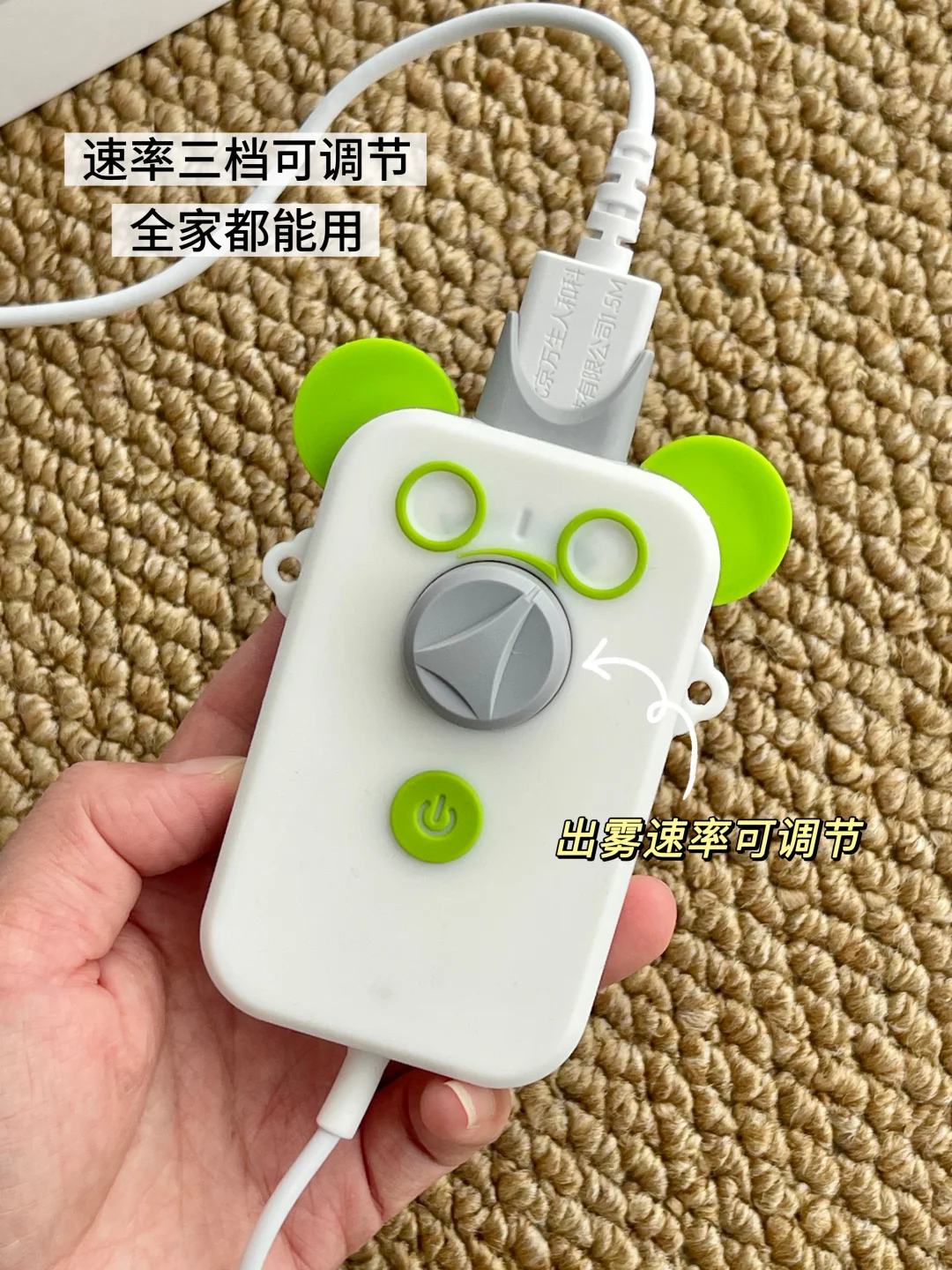 还有几个设计很贴心:有三档可以调节,孩子、老人都能找到合适的节奏;机身小巧,出差旅行带着也方便;而且它雾化的时候药液不会发热,能保持药物活性。