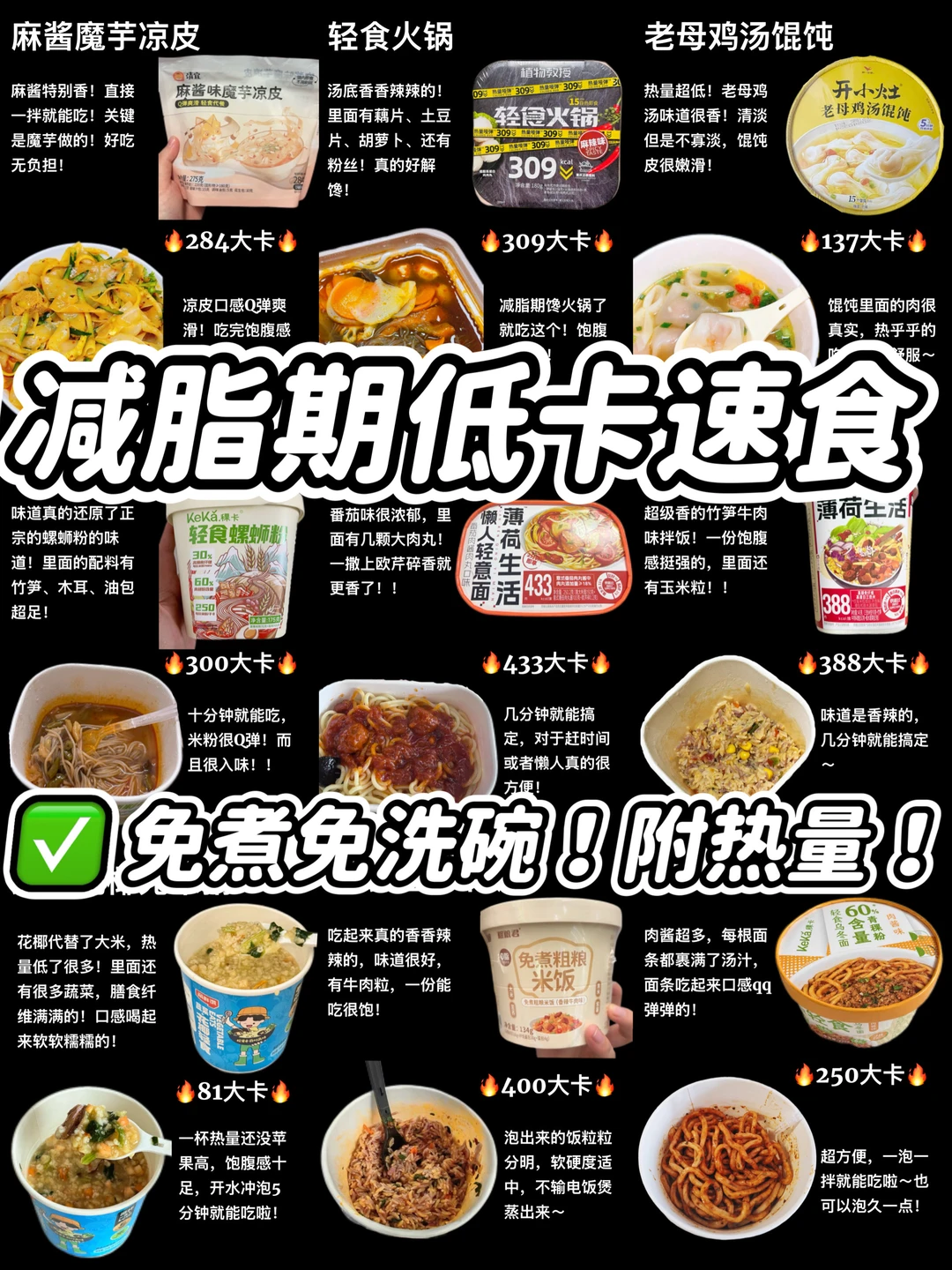 🔥减脂期嘴馋的看过来🤩这9款低卡速食合集‼️亲测巨巨巨好吃✅附详细热量㊙️免煮免开火✅3分钟就能开饭!!无广纯分享‼️宿舍党打工人都能囤👇 附🧾: 麻酱魔芋凉皮 轻食火锅 老母鸡汤馄饨 轻食螺蛳粉 懒人轻意面 竹笋牛肉拌饭 即食花椰无米粥 免煮粗粮米饭 轻食乌冬面 🌟小tips: ✅即食产品钠含量稍高,记得多喝水 ✅搭配新鲜蔬菜营养更均衡!! 💕喜欢速食的姐妹们收藏哦~