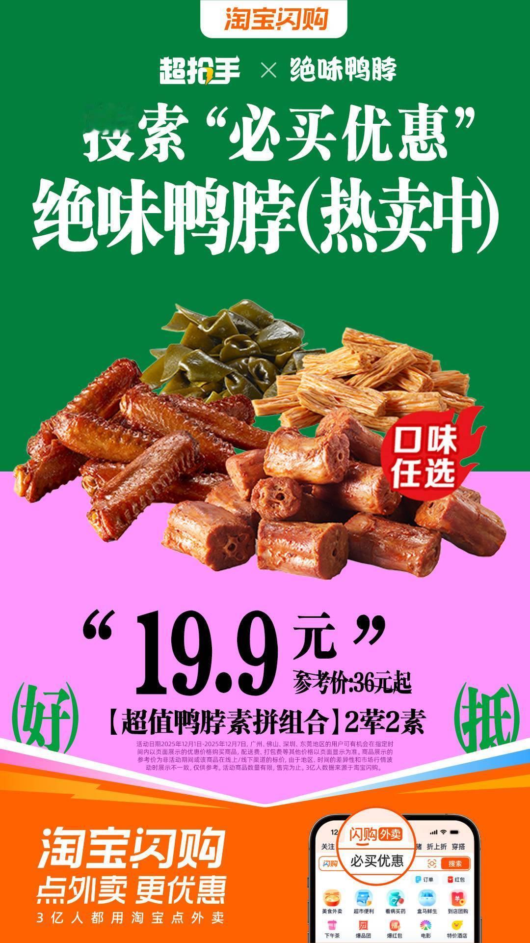 淘宝闪购的绝味鸭脖粤吃粤有味“鸭”力大?就啃它!淘宝闪购必买清单更新,绝味鸭脖多款组合在线等你!上淘宝闪购搜【必买优惠】,大牌靓价19.9元起,满25元送奶茶免单券!绝味鸭脖的超值鸭脖素拼组合2荤2素19.9元起!追剧、看球、唠嗑必备,吃货的快乐就这么简单。必买优惠淘宝闪购必买清单淘宝闪购超级周末
